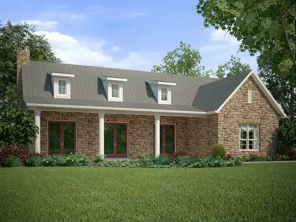 Modeled after a country Craftsman home, this plan offers 1,588 square feet of living space as well as 2 bedrooms and 2 bathrooms, making it perfect for a newlywed couple or first time home buyers. This single story home provides a detached garage for sheltered parking, as well as expansive covered front and back porches that protect from the elements. A beautiful front entryway opens on to the gourmet kitchen that is an entertainer’s dream. The large island and open layout on to the dining and living room makes this space have a natural flow, while the vaulted ceilings make the space feel even bigger than it is. Behind the kitchen you will find this home’s 2 bedrooms; the master suite and a secondary bedroom that would work great as an office or nursery, or even a guest space. Both bedrooms feature private attached bathrooms as well as large walk-in closets, giving this home a great amount of storage as you begin to make and accumulate mementos and memories.