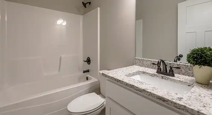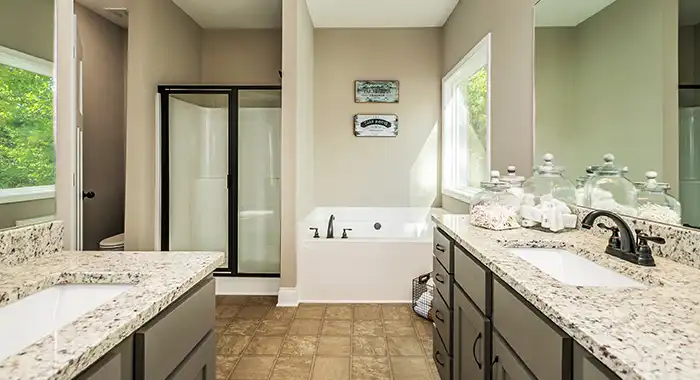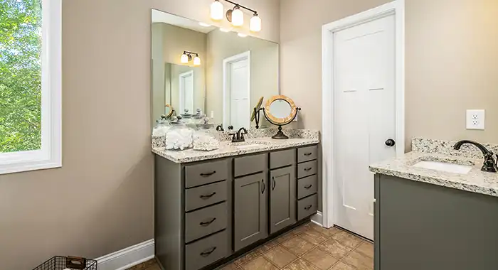 This house plan is a split bedroom design with two bedrooms on the left side sharing a full bathroom and the Master Suite on the right featuring a deluxe dressing room, whirlpool tub, double bowl vanity, shower and large walk-in closet.