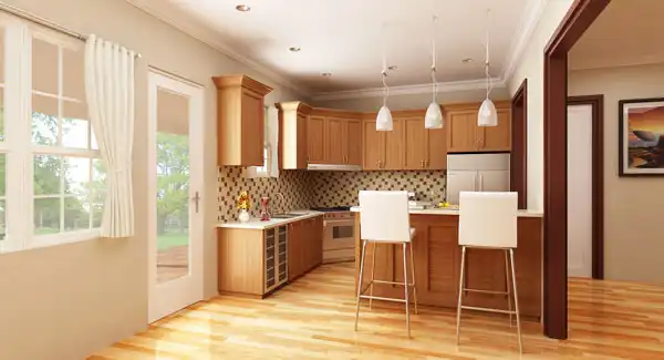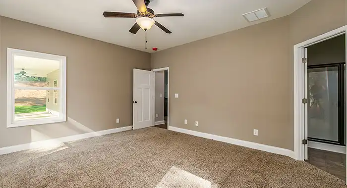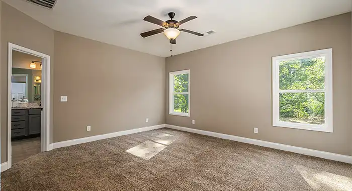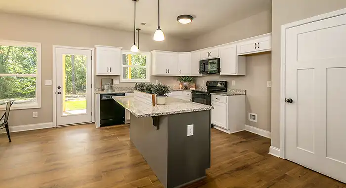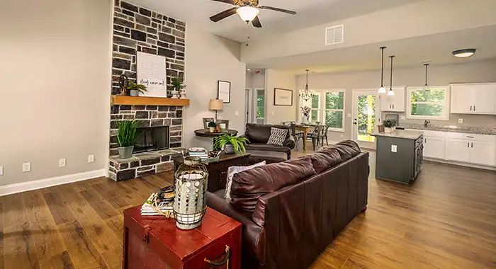 This one level 1,492 square foot home features an open floor plan with a great room, dining room and spacious kitchen that flow together to provide a large family gathering space. The entertainment alcove and a fireplace can be viewed from all three locations. The kitchen area features plenty of counter space, cabinetry, an island and a pantry. For the living areas we featured