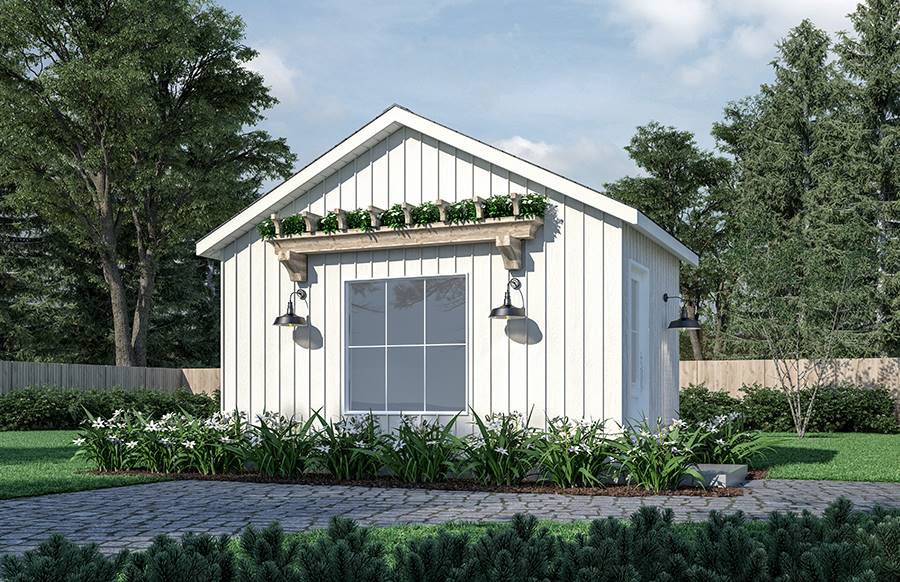 Take a look at Plan 5464 if you're in the market for a chic country shed with plenty of storage potential! This design offers 160 square feet in a 16' by 10' footprint. There's a centered window in front while the entry door is on the right. Inside, you'll appreciate built-in hanging hooks and shelving as well as open space for lawn equipment.