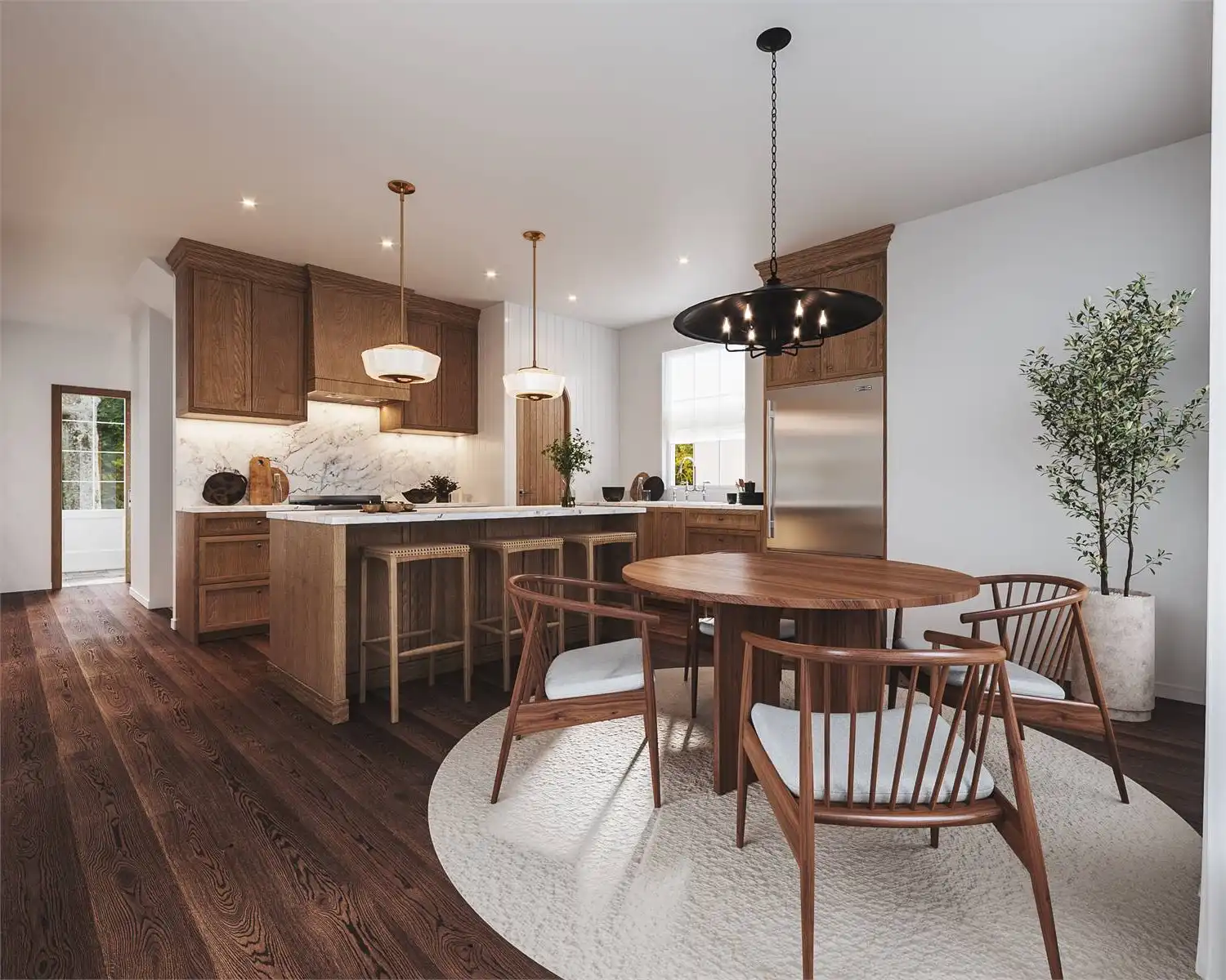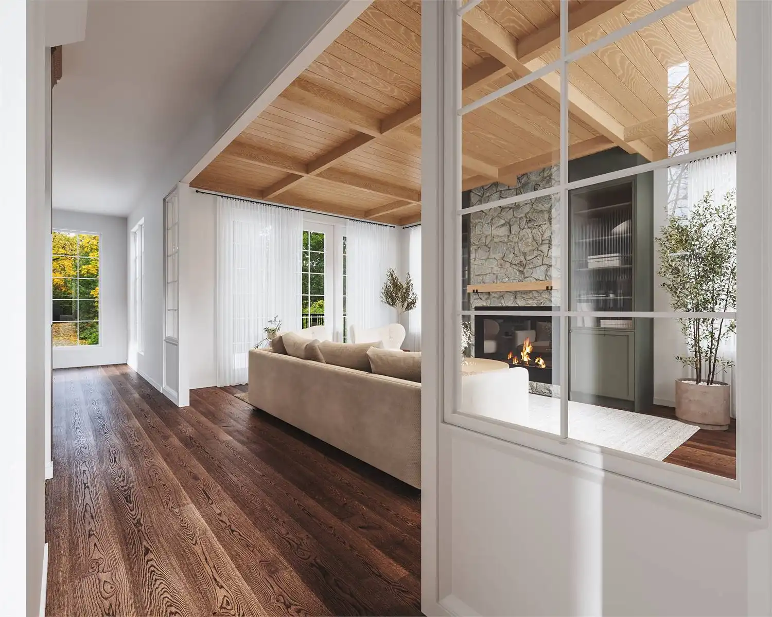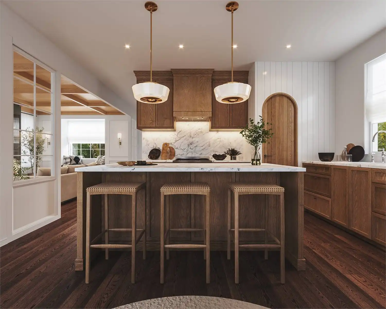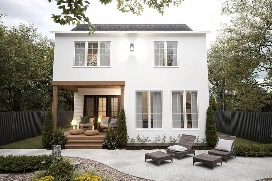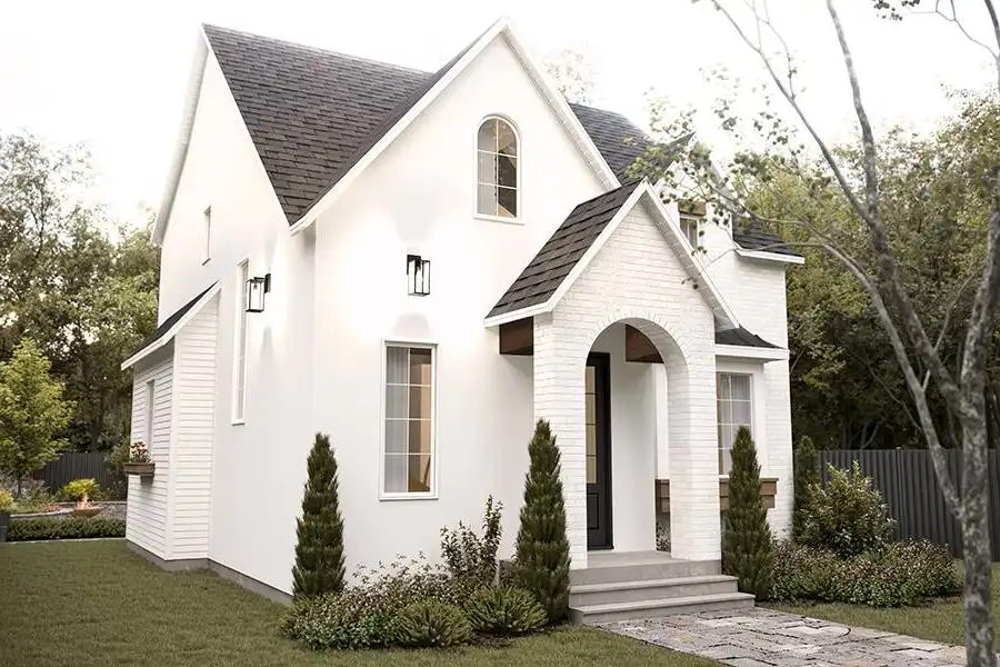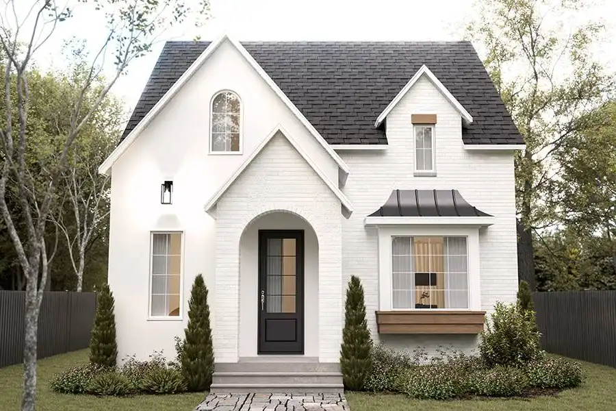 Introducing House Plan 5474, an enchanting 2,502-square-foot cottage home that invites you into a world of timeless elegance. Step through the front door into a bright foyer with ample storage for coats and shoes, setting the stage for the charm that awaits inside. The living room effortlessly combines comfort with modern style, creating a warm and welcoming atmosphere. Enjoy the perfect mix of natural light in the dining area, bathed by floor-to-ceiling windows that showcase the beauty of the L-shaped kitchen which features a spacious island with seating, making it an ideal space for enjoying family moments together. Access to the covered patio from both the dining area and the living room seamlessly integrates indoor and outdoor living, creating the perfect ambiance for gatherings. Upstairs, discover the master suite with stunning cathedral ceilings that enhance the sense of space and luxury. Complete with an ensuite bathroom and a spacious walk-in closet, this sanctuary offers the utmost comfort. Additionally, find an office nook, a convenient laundry room, and two generously sized bedrooms that share a well-appointed full bathroom. The basement unveils a lovely guest suite with a walk-in closet and ensuite, ensuring every guest feels at home. The entertainment space is elevated with an impressive home theatre and a stylish wet bar, setting the stage for unforgettable gatherings and creating countless memorable moments. House Plan 5474 is more than just a home; it's a living experience where timeless charm, luxury, and practicality come together to create the perfect retreat for you and your guests.