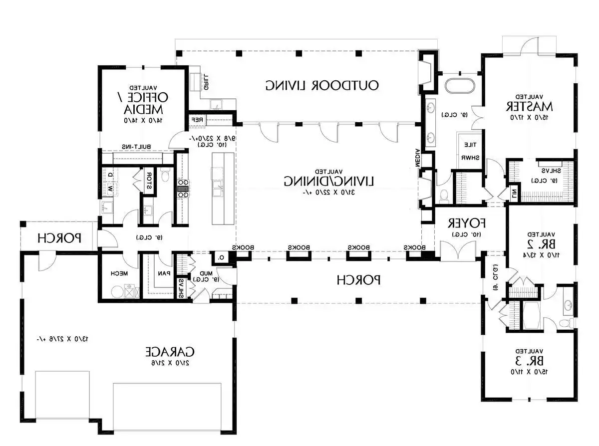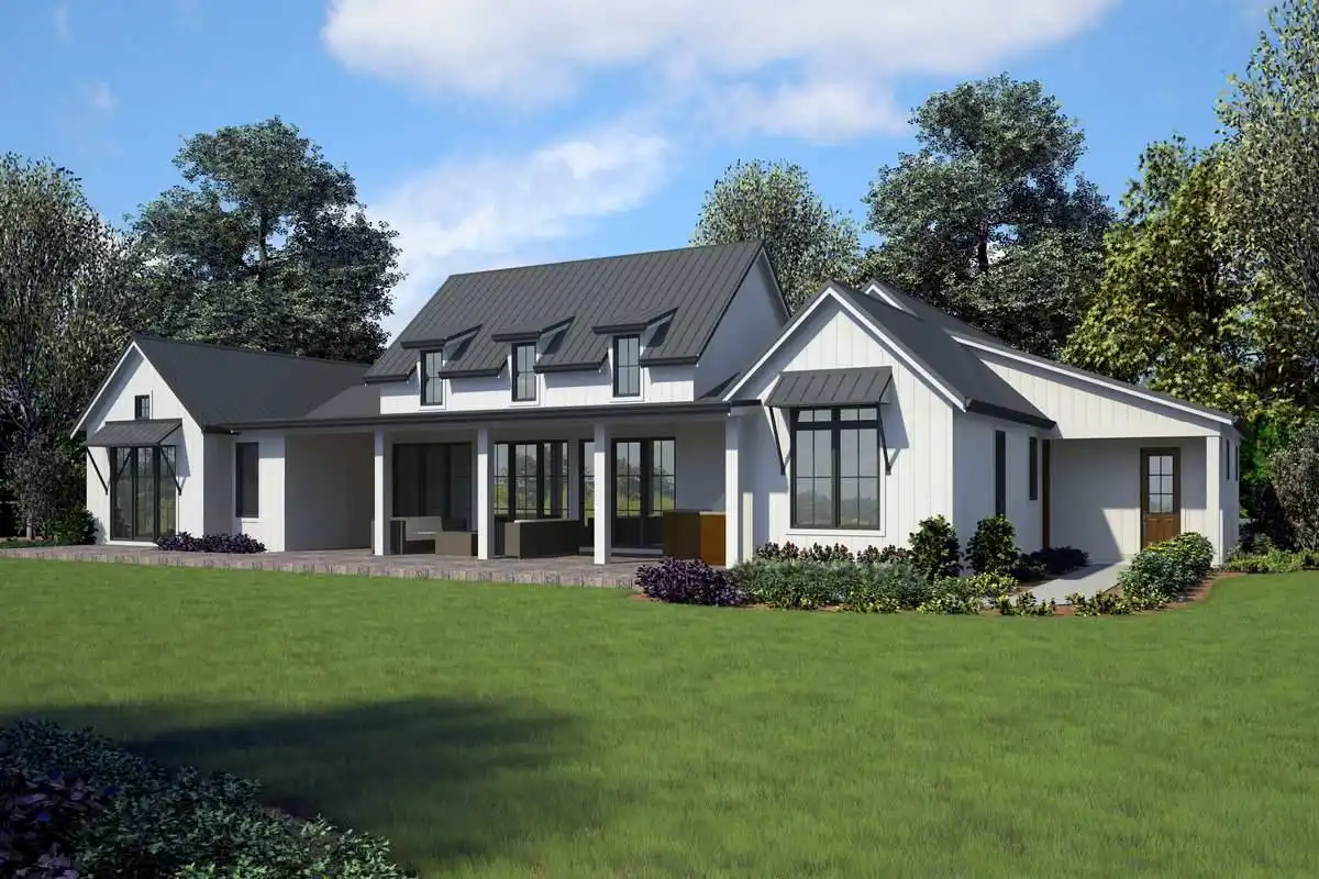 An inviting front porch adorns this country-style house plan, with three bedrooms, 2.5 baths and 2,798 square feet of living space. Entertain guests in the open and vaulted living/dining room of this home plan, warmed by a fireplace. Expand your party to the covered outdoor living area for a breath of fresh air. Note the summer kitchen and the stately fireplace. The island kitchen serves any meal with taste; a handy pantry is just steps away. At day's end, retire to the vaulted master suite, with outdoor access and a walk-in closet. A garden tub anchors the personal bath, along with a tile shower and two sinks. Two additional vaulted bedrooms flank a shared bath. Builders point out the versatile vaulted office in this home design, which would make a nice guest room or media room.