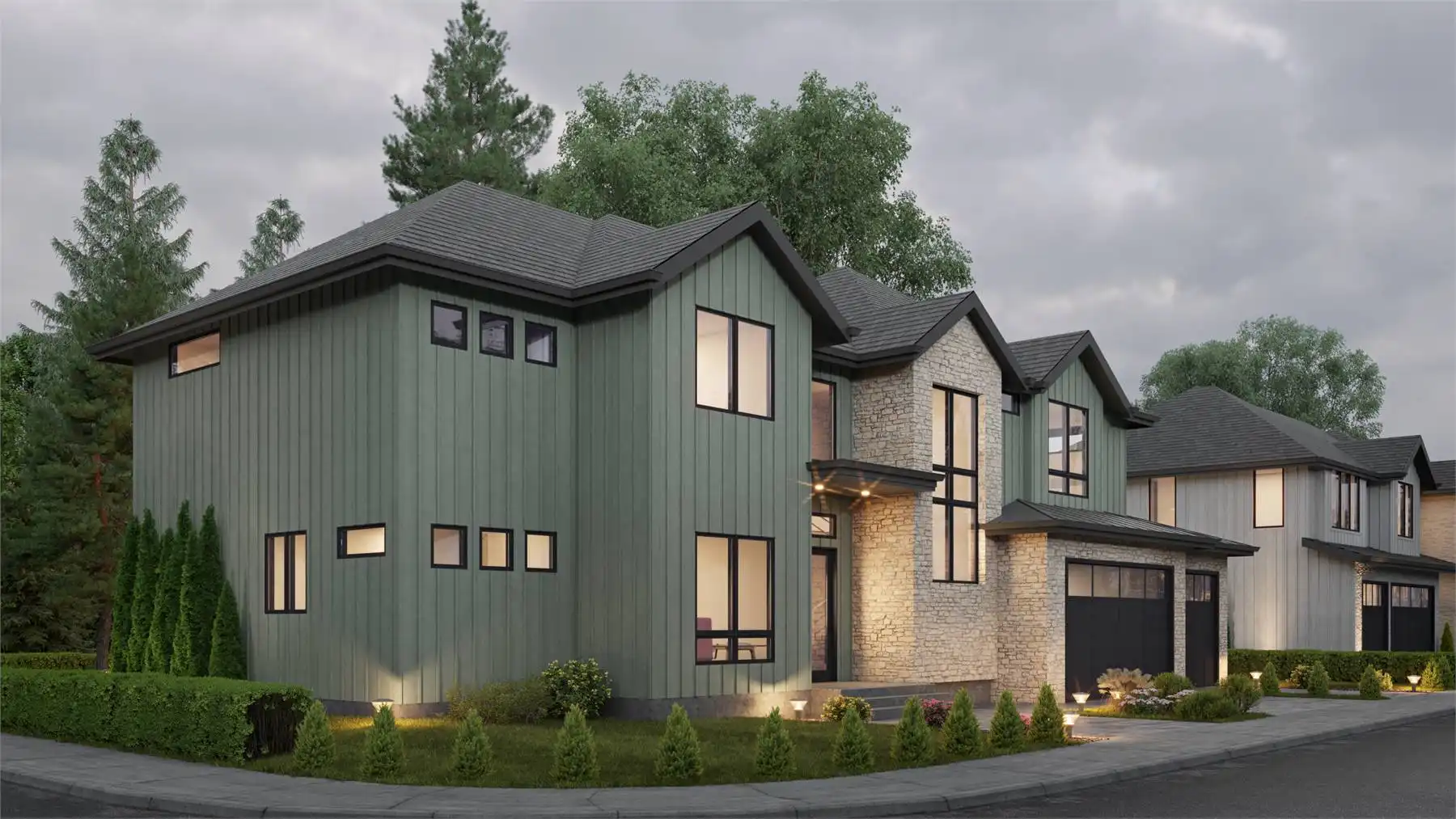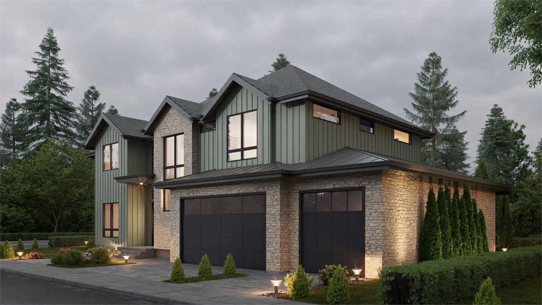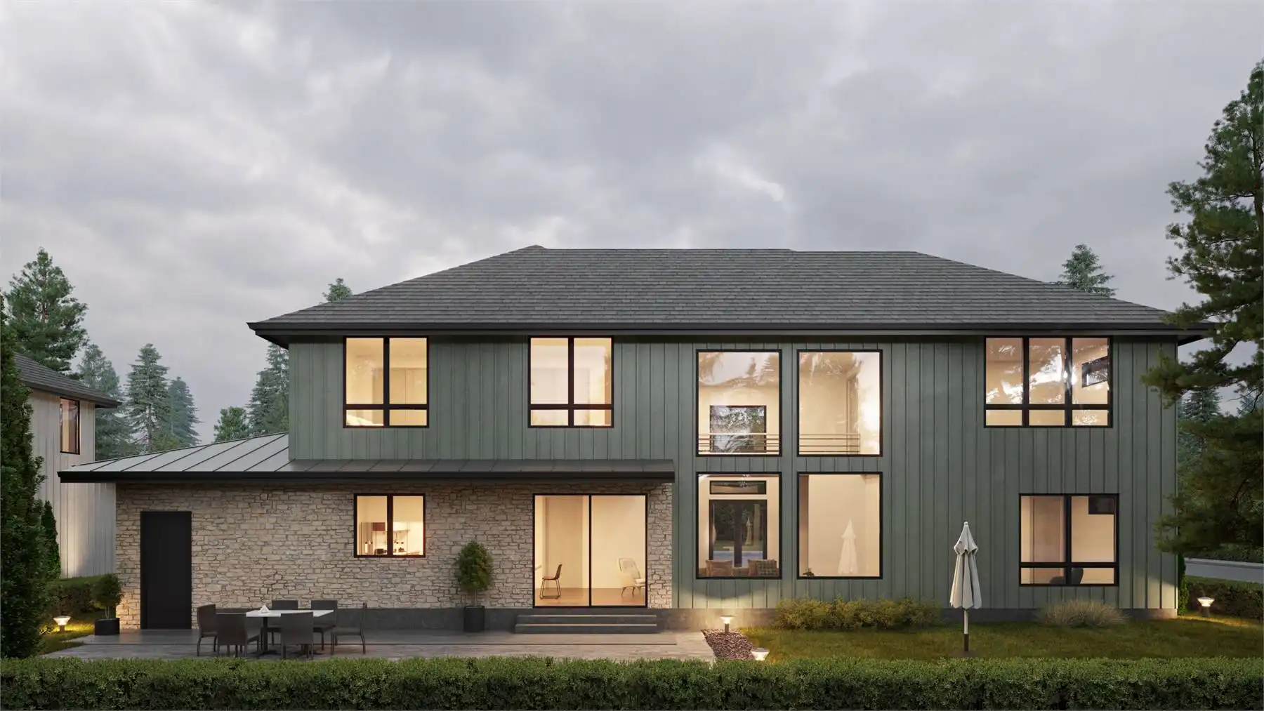 This transitional 5-bedroom house plan offers a generous 3,037 square feet of heated living space, featuring five bedrooms, with four of them thoughtfully situated on the upper level along with the laundry facilities. On the main floor, you'll discover a well-appointed guest suite, as well as a dedicated den tucked behind elegant French doors, creating an ideal work-from-home space. Upon entering through the French doors into the foyer, you'll be welcomed by the expansive and airy two-story family room. Large windows provide picturesque views of the rear of the property, while a fireplace positioned on the right wall offers a warm and inviting focal point visible from the kitchen, creating a cozy ambiance that permeates the entire home. The kitchen is equipped with a substantial island and a true walk-in pantry, ensuring ample space for both culinary endeavors and storage requirements. On the left side, the 3-car garage boasts extra depth, providing additional storage opportunities. Conveniently accessible from the dining room, it features sliding doors leading to the backyard, enhancing both practicality and seamless connection to outdoor spaces.