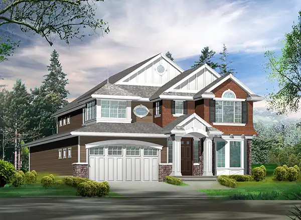 Interesting details lend a Craftsman beach look to this two-story house plan, with 2,520 square feet of living space, and three bedrooms and 2.5 baths. Converse with friends in the bayed living room and the classic dining room in this home plan. The island kitchen with pantry flows into the versatile nook. A high ceiling visually expands the comfortable family room, warmed by a fireplace. Upstairs, a cathedral ceiling presides over the sizable master bedroom in this home design. The posh master bath boasts a garden tub, a separate shower and two sinks, along with a walk-in closet. Two more bedrooms share a split bath. Builders point out the versatile den and the quiet loft. Don't overlook the three-car tandem garage.