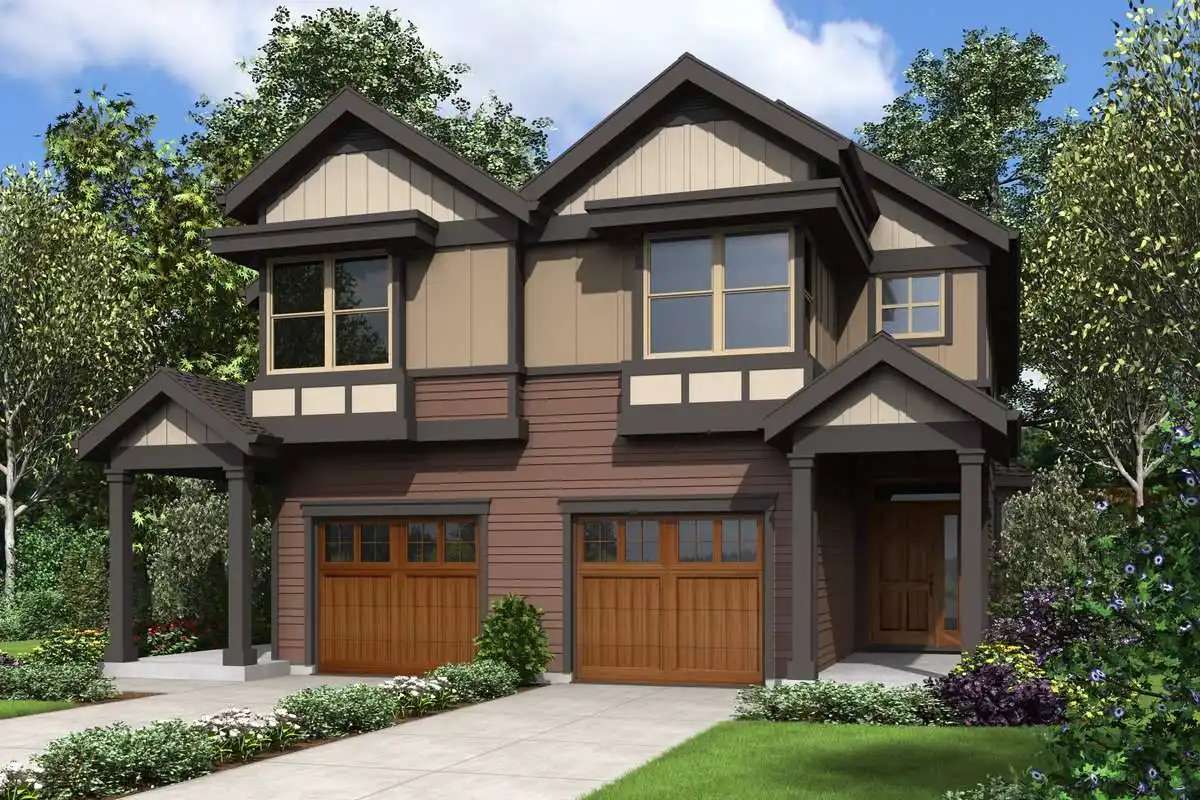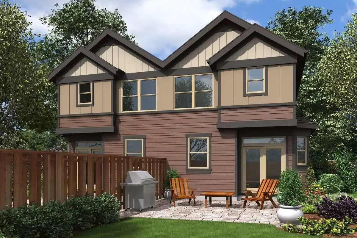 This duplex features an amazing amount of Craftsman style charm, in an affordable and efficient package. Both sides of this two-story design averages just over 1,500 s.f. and features 3 bedrooms and 2.5 bathrooms, as well as a garage and private outdoor living space. The first level begins with the foyer which leads past a half bath and in to the living room and its open concept kitchen and dining room. The second story is home to the sleeping quarters, finding the master suite and its private bath and walk-in closet providing you with ample space to unwind and relax. Two more bedrooms share a hallway bath and are a great space for growing kids or guests to enjoy their own private space.