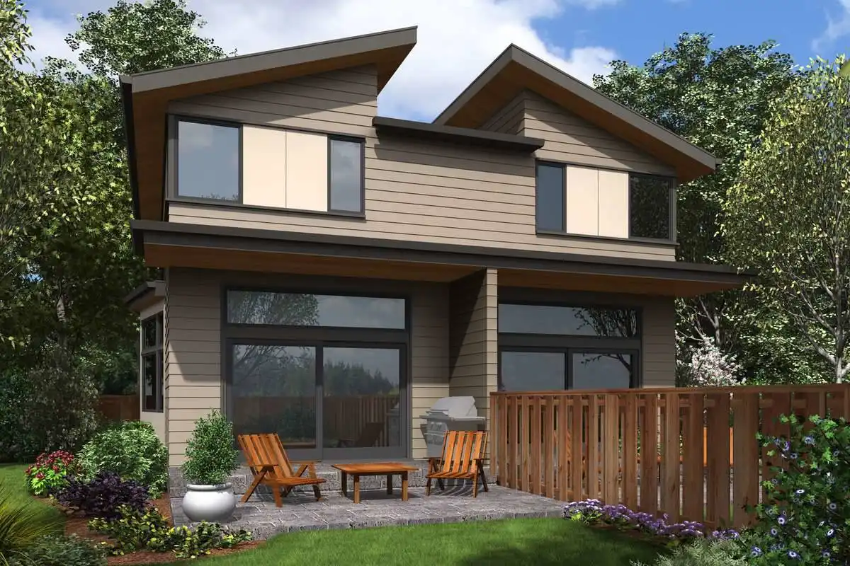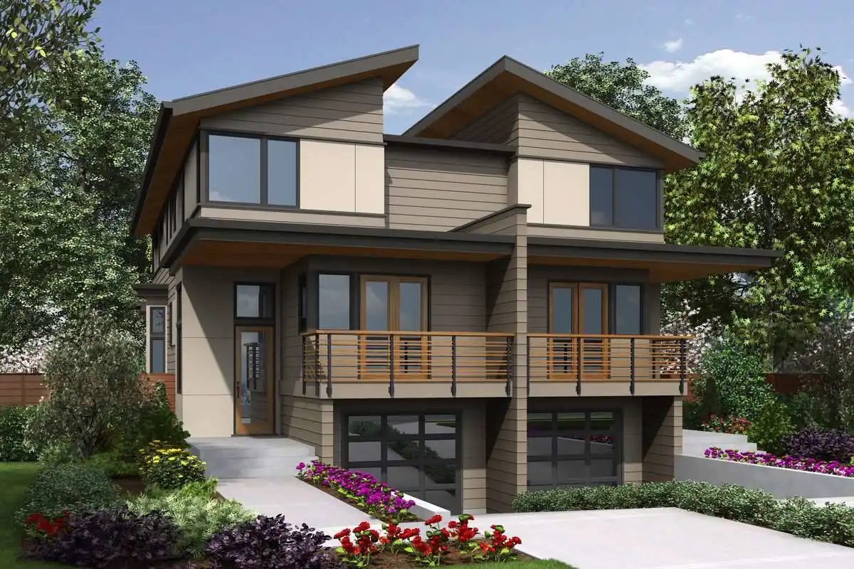 This modern style duplex maximizes its footprint, offering 2 spacious units with 3 levels a piece. A drive-under garage for each unit means that these homes take up a reduced amount of lot space, making them great for a limited build. From there, each side offers 2,001 square feet of living space, each with 2 bedrooms and 2.5 bathrooms, both sides having identical layouts. Once you park your car, move upstairs to the main level where you will find an office and powder room, as well as a quaint eat-in kitchen and a combined living and dining room space with a private balcony. The top level of each unit features all of the sleeping quarters, including the master with its large bathroom and dual his and hers walk-in closets, along with a second bedroom with its own en-suite and walk-in closet. The size of this efficient plan makes the units great options for a new couple or first-time home buyers.