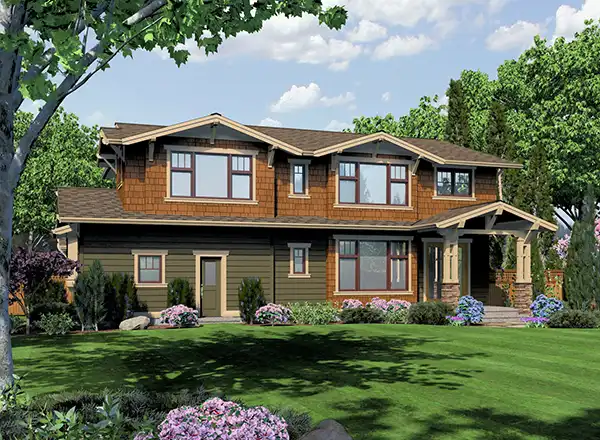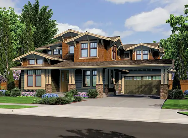 Multiple gables with decorative brackets enhance the curb appeal of this two-story bungalow house plan, complete with four bedrooms, 3.5 baths and 2,483 square feet of living area. The spacious great room in this home plan boasts a high ceiling, a fireplace and backyard views. The well-planned kitchen serves the open dining room with ease. When weather permits, take your meals on the breezy covered patio. At day's end, retire to the vaulted master bedroom for quiet relaxation. You'll love the personal bath with its garden tub, separate shower, twin vanities and walk-in closet. Upstairs, the second bedroom in this home design would be great for overnight guests, with its vaulted ceiling, walk-in closet and private bath. Curl up with a good book in the peaceful den, surrounded by a porte cochere and a refreshing patio. Our customers love the versatile loft/bonus room.