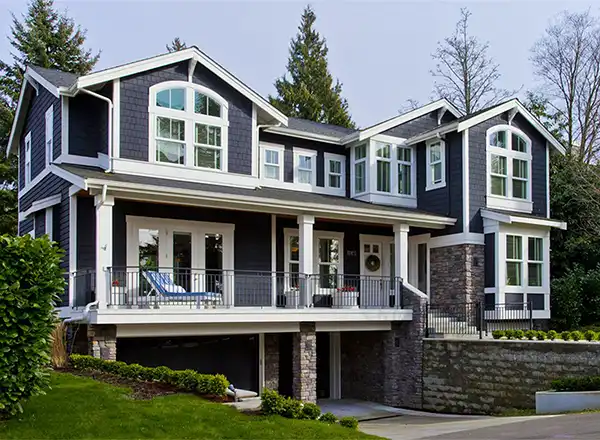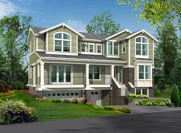 A welcoming front porch adorns this traditional three-story house plan, which includes four bedrooms, 3.5 baths and a luxurious 3,026 square feet of living area. A fireplace crackles in the sizable living room in this home plan. The open kitchen with island is just steps away from the formal dining room and the casual nook. French doors open to a covered deck. Enjoy any gathering in the family room with fireplace, then expand it to the front porch of this home design. Upstairs, the large master bedroom boasts a two-way fireplace and a walk-in closet. Refresh yourself in the private bath, with its garden tub, separate shower and dual-sink vanity. Builders point out the peaceful den, the office/nursery and the enjoyable recreation room.