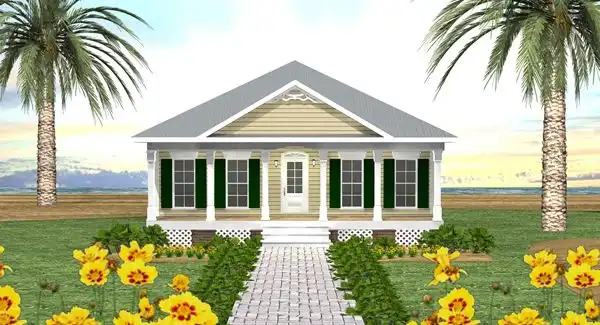 Step inside this cottage of yesterday and enter into a large great room that opens to the kitchen. Three generously sized bedrooms are lined up to the left side of this design. The master bedroom is situated at the rear and features a large walk-in closet and two basin bath areas. The middle bedroom has a walk-in closet also.