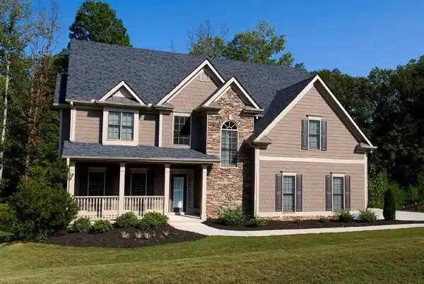 A mixture of stone, shakes and siding create interest for this charming two story plan. The radius window accents the front porch with arched soffit with a flower box over the stairwell to the left. The foyer opens to the two-story living room accented by the u-shaped staircase that helps make the living area seem expansive.