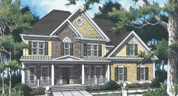A comfortable Southern porch welcomes guest to this otherwise classic traditional home. Interior features include an angled staircase, a Juliet balcony, an oversized work island and walk in pantry. Just to name a few. The staircase splits and gives direct access to the kitchen without the added cost of a back staircase. A beautiful master suite occupies its own wing across the balcony from the other rooms providing a split bedroom affect on the 2nd floor.