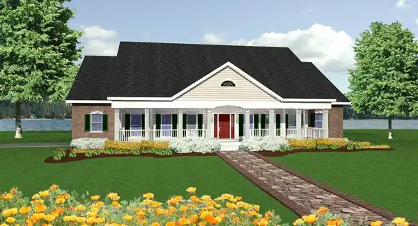 A wide front porch hugs the front of this traditional home. Arches accent the exterior, dining room and sunroom. The great room fireplace is wrapped by cabinets for storage, french doors lead onto the rear porch. This plan has plenty of extras like a computer room, large laundry, walk-in pantry and guest bedroom.