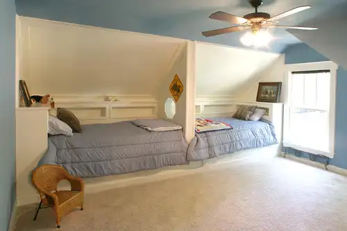 A beautiful master suite awaits on the second floor featuring a sitting room with fireplace and a master bath suite fit for a king. The bedroom above the garage utilizes the sloped ceilings to provide the option of built-in bunk beds for two siblings close in age to share.