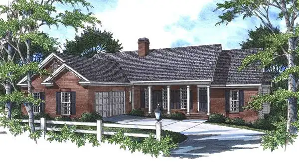 An inviting front porch draws you in to sit and watch the children play on their bikes as they ride around on the courtyard driveway in this affordable traditional ranch house plan. A master suite is taking over one end of the house with an oversized walk-in closet and bath with all the amenities. The jack & jill bath and walk-in closets create the perfect place for any age children to live. Stairs next to the garage allow for easily accessible basement and the attic providing the most amount of storage in this design.