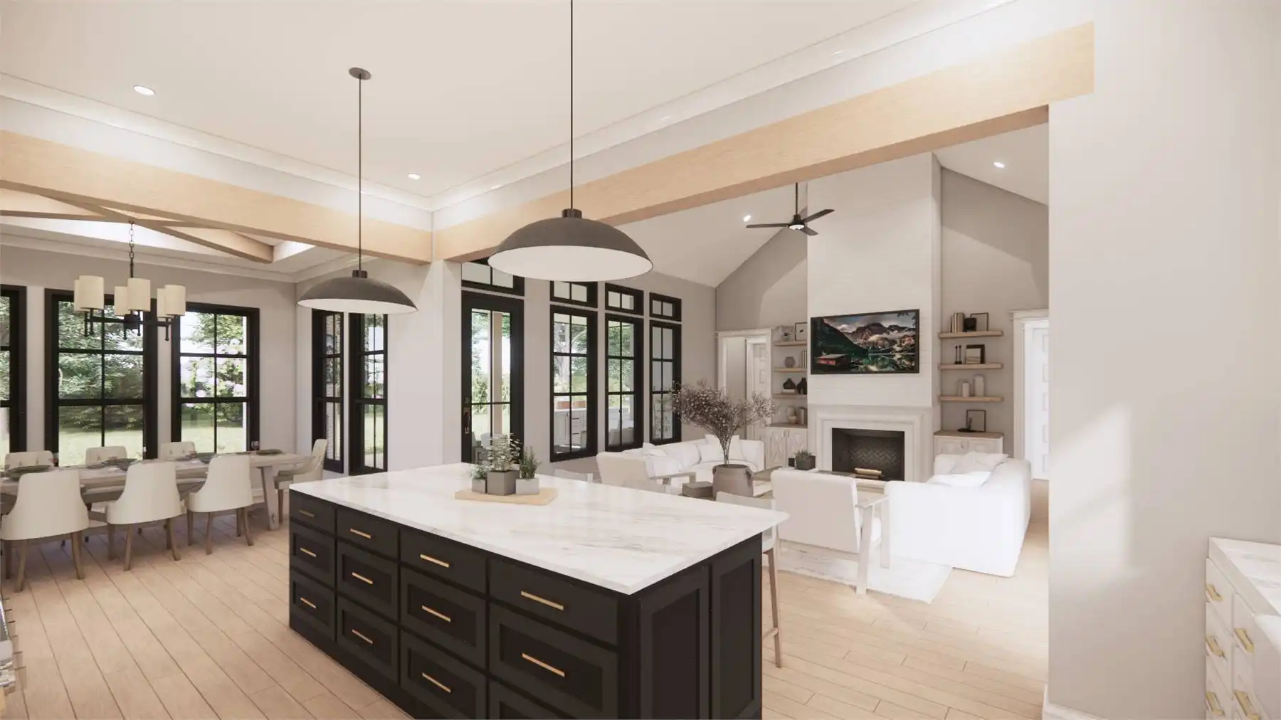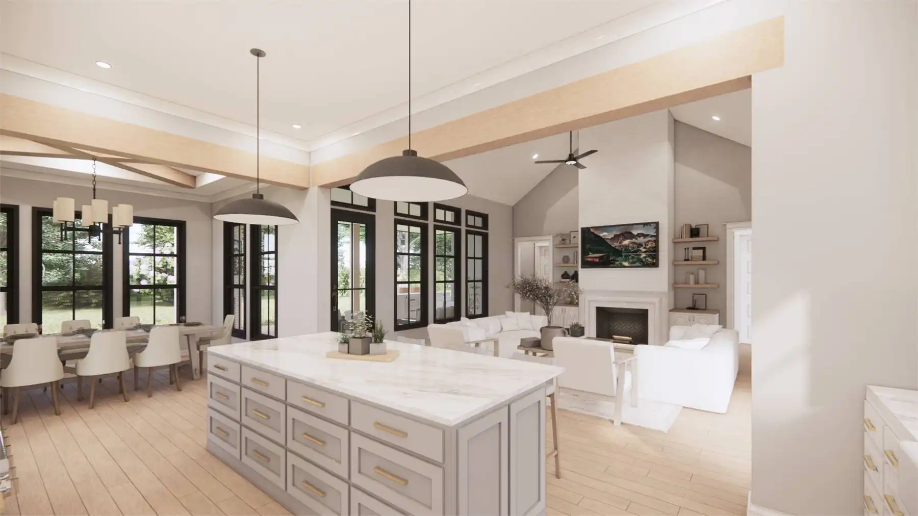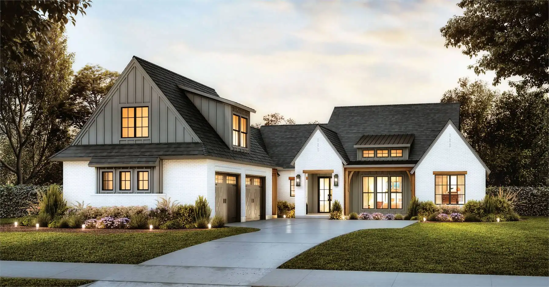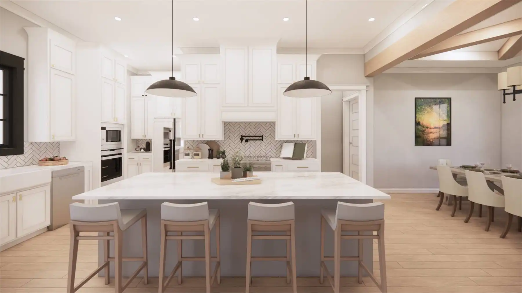 Welcome to the charm of country living with a modern twist. This stunning one story Transitional Farmhouse with 2,768 square feet blends a rustic aesthetic with contemporary amenities. With four large bedrooms that are separated from the main bedroom for privacy so everyone will have their own personal space in this house. The open-concept living area, where the kitchen, dining area, and family room easily combine into a warm and inviting gathering zone, is the focal point of this entire home. Equipped with modern amenities and a spacious island, the chef-inspired kitchen makes meal prep easy. Throughout the home, you'll appreciate the attention to detail, from the charming fireplace in the family room to the convenient mudroom off the garage. Experience the serene beauty and modern comforts of this Country Farmhouse plan.