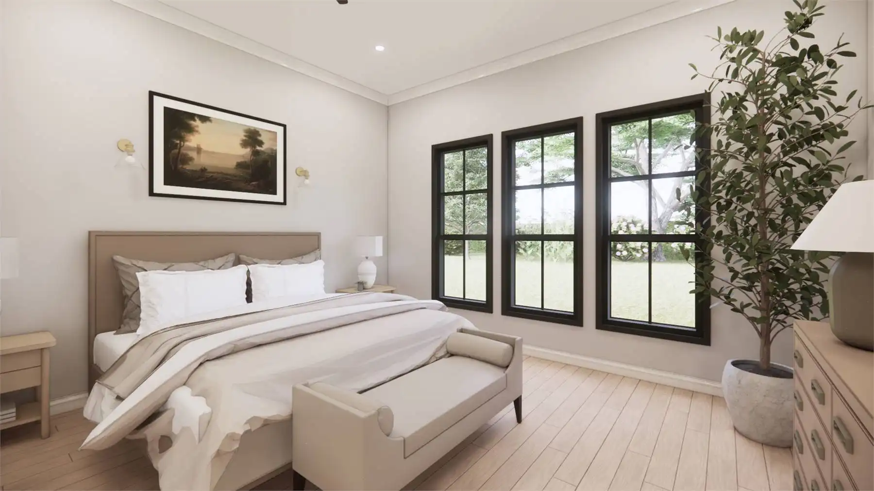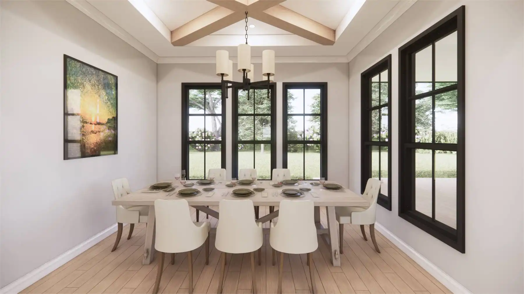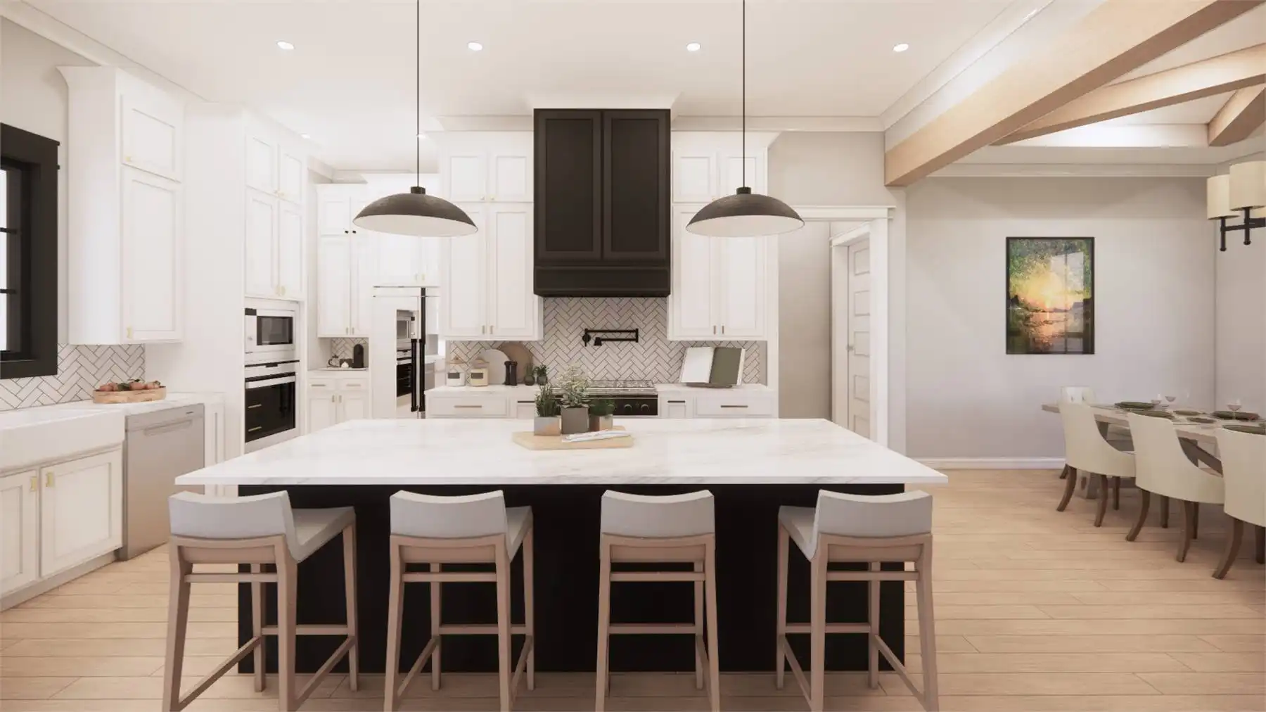 Welcome to the charm of country living with a modern twist. This stunning one story Transitional Farmhouse with 2,768 square feet blends a rustic aesthetic with contemporary amenities. With four large bedrooms that are separated from the main bedroom for privacy so everyone will have their own personal space in this house. The open-concept living area, where the kitchen, dining area, and family room easily combine into a warm and inviting gathering zone, is the focal point of this entire home. Equipped with modern amenities and a spacious island, the chef-inspired kitchen makes meal prep easy. Throughout the home, you'll appreciate the attention to detail, from the charming fireplace in the family room to the convenient mudroom off the garage. Experience the serene beauty and modern comforts of this Country Farmhouse plan.