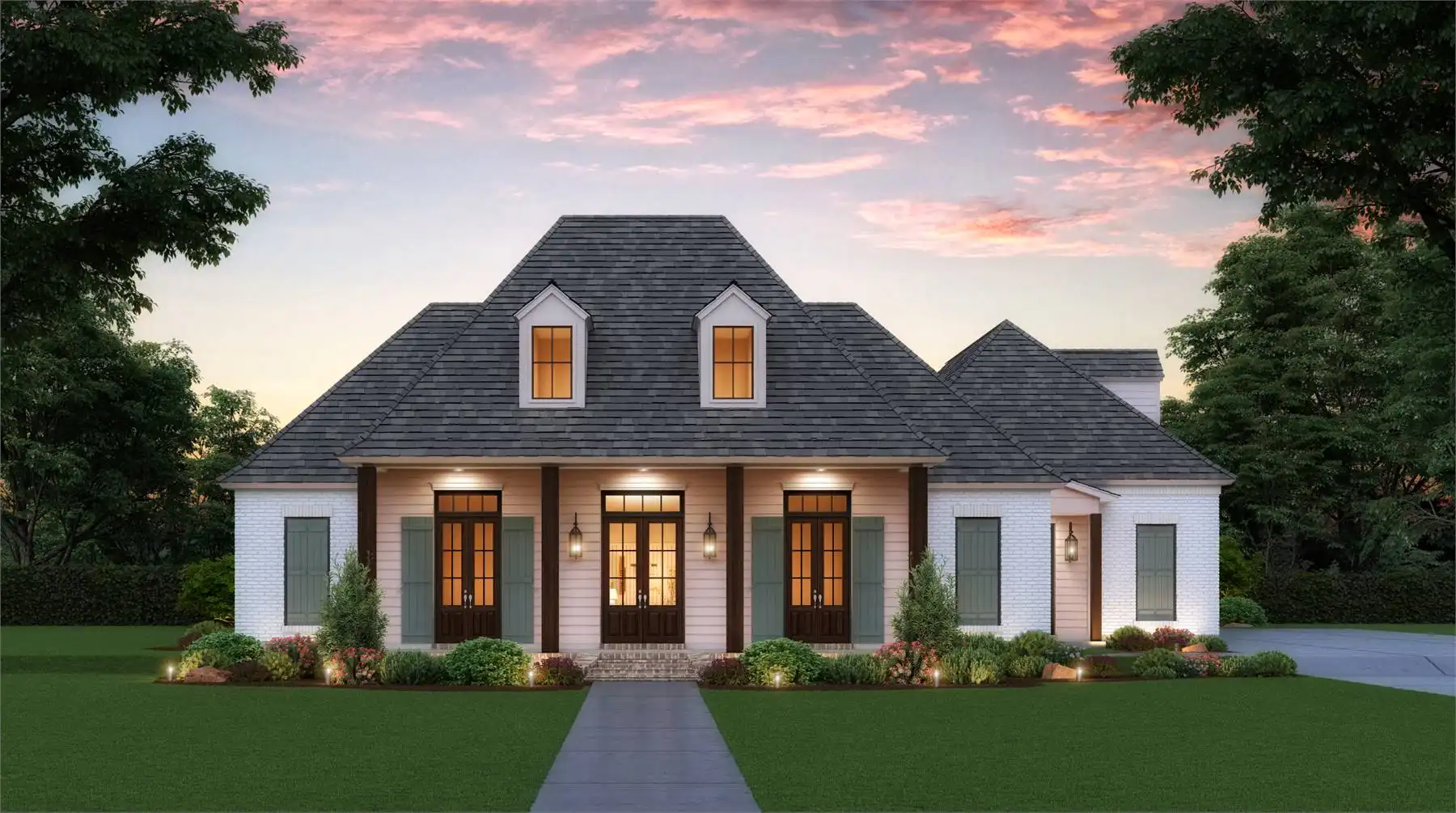 This impressive, country house plan in the Acadian style is perfect for those northern climates to allow the snow to easily fall off the roof. This helps with maintenance of the roof and safety for those under it. The front porch with triple, French door entry provides both light and access to the home. The foyer and formal dining room invites you into the large family room with cozy fireplace. The large kitchen with island and dining nook provides a nice space to create amazing meals for family and friends. On the left side of the home you'll find the laundry, mud room, bathroom and secluded bedroom which can be used for guests or the teenager in the family who desires a bit. more privacy from the younger siblings. The stairs to the large bonus room is also located here. Though the mud room, you'll access the garage areas. One two-car garage and one one-car garage which can also be used for storage. On the right side of the home you'll find the secondary bedrooms with Jack and Jill bathroom and finally the luxury master suite which boasts an extremely large master closet, dual vanities, separate tub/shower areas and a water closet. This home is designed to impress.