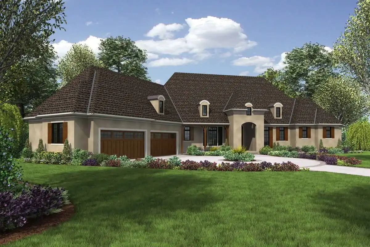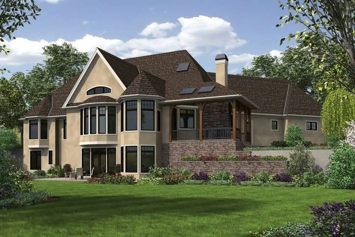 This spacious European estate is perhaps one of our most impressive offerings yet. Boasting 5,575 square feet of living space that includes things such as 4 bedrooms and 3.5 bathrooms among its two levels, this home is sure to feel comfortable, no matter how many people live in it. The impressive drive up is capped off with a stately facade that brings with it a hint of Mediterranean flair. Step on to the covered front porch that is shielded from the elements before entering in to the grand foyer. If you immediately turn to your left and move down the hallway, you will be pleased to discover a private wing of the home, completely dedicated to you! A home office joins with the nearby master suite which features an astounding spa bathroom, dual his and hers closets, and even your own private patio and fireplace! The main living space of the home is equally as impressive, beginning with the vaulted great room which is open to the gourmet island kitchen, formal dining room and breakfast nook. The breakfast nook opens on to an impressive terraced deck and covered outdoor living space, making it great for neighborhood gatherings. Downstairs, the basement is equally if not more impressive. Here you will love that you have your very own movie theater, complete with its own bar and wine cellar. An exercise room ensures that you can always stay fit and healthy, while three more bedrooms and 2 full bathrooms make this space a great area for the kids and guests to maintain their privacy.