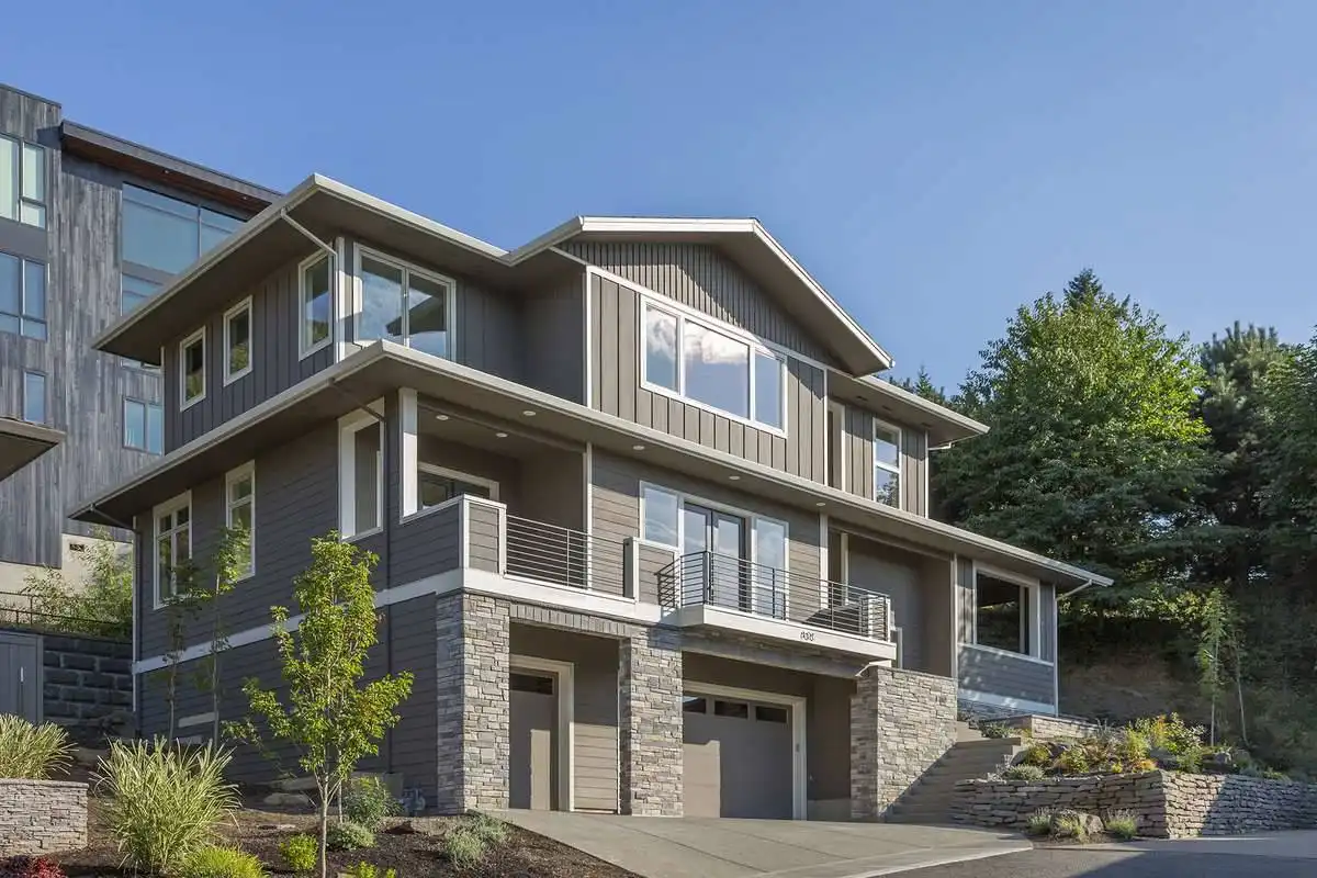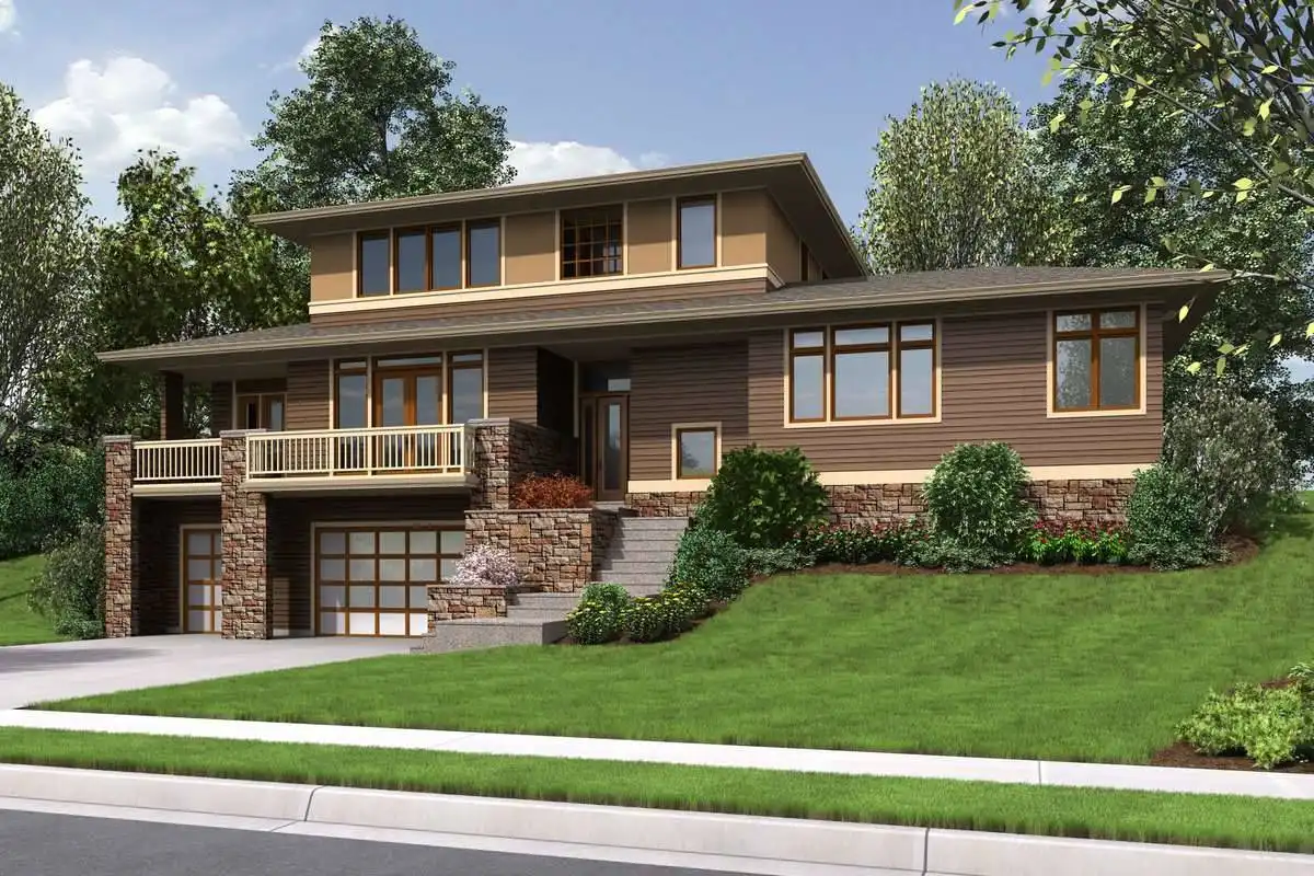 This 2-story modern style home is great for building in a place where space may be at a premium. By utilizing vertical instead of horizontal construction, this home maximizes its 2,737 square feet, beginning with a drive-under garage. Once parked in one of the 3 garage spaces, move upstairs by either the stairs or with your very own elevator, making this home handicap accessible throughout. Upstairs, you will be in amazement at this sprawling layout which includes a wraparound front deck, accessible via the 2-story great room. Once you step foot off of the stairs or elevator, the master suite is right nearby, featuring a spacious bedroom, relaxing spa bathroom, and a large walk-in closet. Also close by is a large laundry room and a powder room for added convenience. Past the front door and its 2-story foyer, you find yourself in the gourmet island kitchen with its walk-in pantry, while the open concept has the 2-story great room and dining room. A nearby private den is a great option to double as a home office if necessary. Upstairs, this home is finished out by two bedrooms and a full bathroom that look down upon to the open-air great room below, giving the space a sense of grandeur about it.