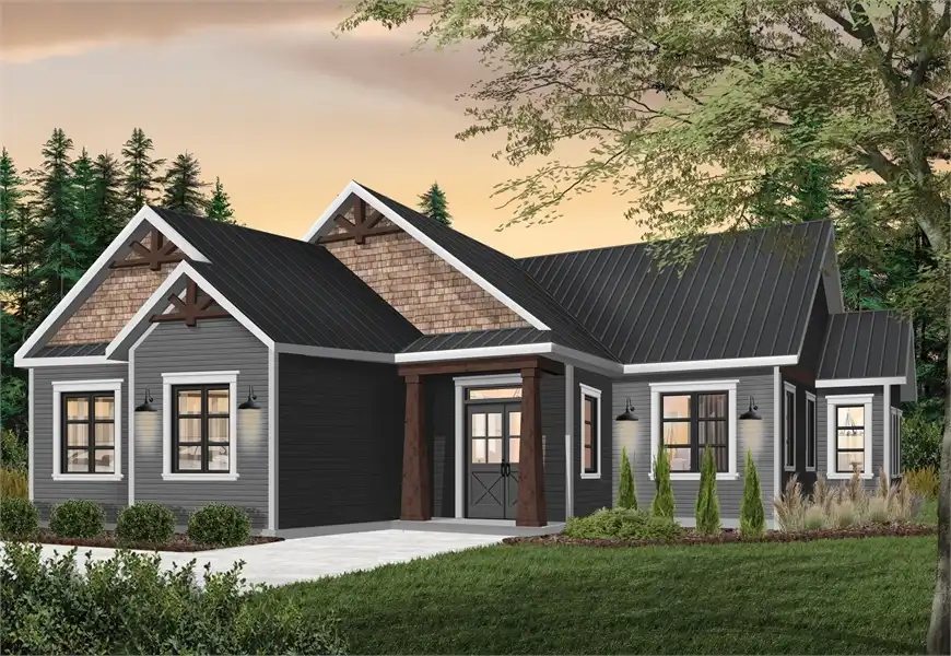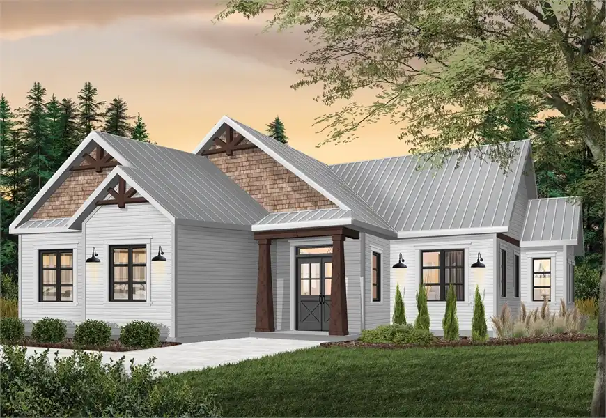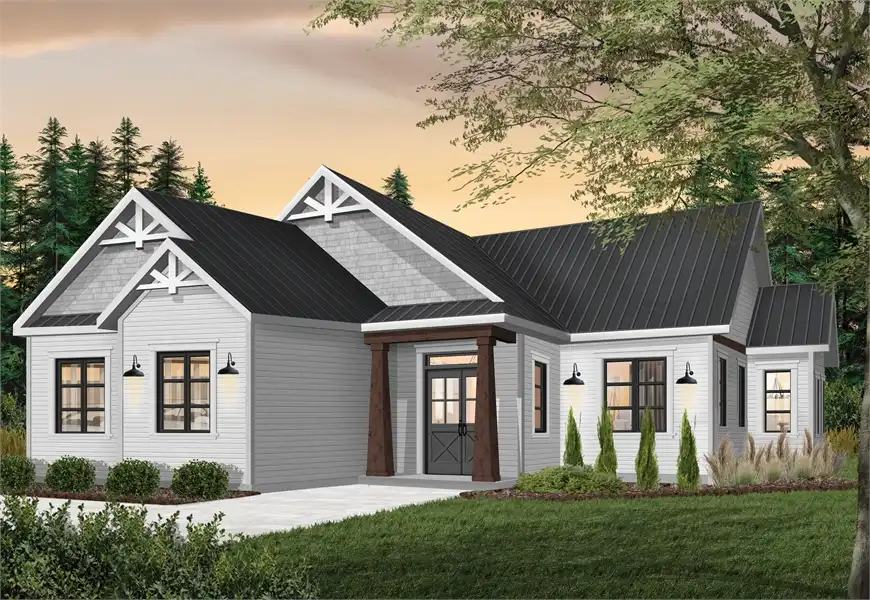 This 1,525 square foot rustic country style home with decorative exposed wood beams is ideal for a narrow lot (48' wide). With 9' ceilings throughout the house, a closed foyer with coat closet, and open floor plan concept with fireplace, this home would be great for that first time home buyer or an empty nester. The large kitchen has an island with seating for three. The 3 bedrooms share a full bathroom and a powder room. A large storage closet and laundry room are located near the garage access door, where you will find a double car garage with side entry and direct access to the house. This plan features a floating slab, but many other foundation options are available.