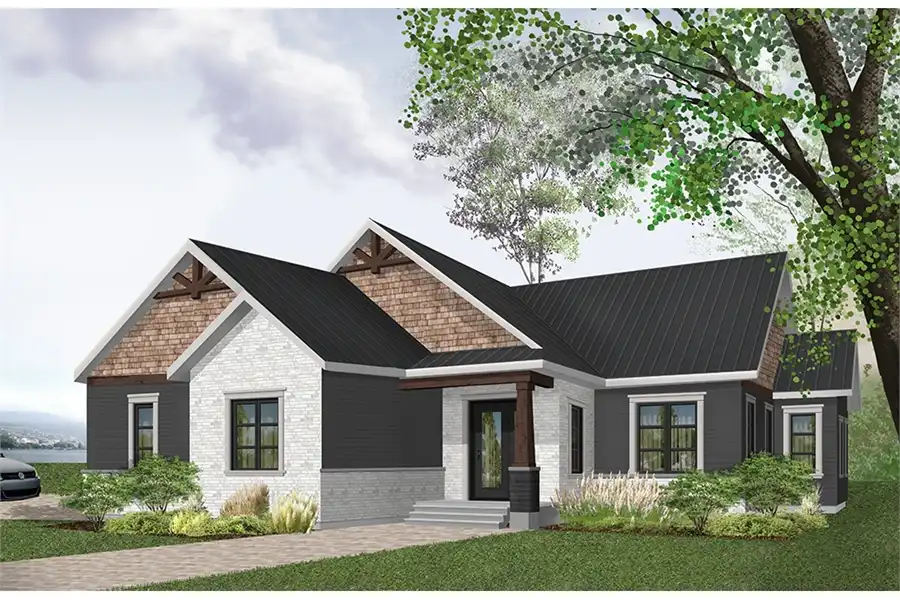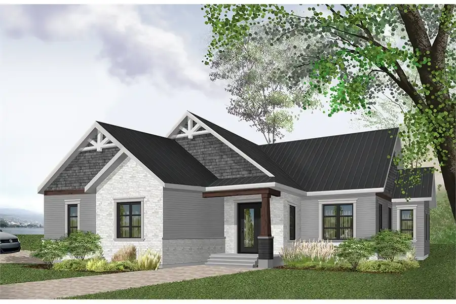Wanting to meet a great demand for the popular rustic house style exposing decorative wood beams on the front, we offer here the basic model of our latest collection of Craftsman style house plans, or Rustic Country (or Northwest), offering 3 bedrooms. From the beginning we wanted to incorporate an open floor plan concept for the family, because it is in demand and very trendy. Cook and chat with your guests while listening to crackling fire in the living room and sipping a glass of wine, it's really trendy! In addition, the large island in the kitchen will promote communications with your guests or homework assistance while preparing dinner! You can access a deck via a patio door in the dining room. You will be charmed by the master suite which has a large window, a private bathroom with shower and a large walk-in. The two secondary bedrooms share a good size bathroom with double vanity and shower bath. A separate good size laundry room is available with counter top and sink, and is well located, hidden from the activity area. For this home plan model, we offer a sided two car garage, but note that we also offer other versions with double garage and without garage, see other plans from this collection. In addition, the plan includes an unfinished basement. It is possible to make changes to the plan floor.