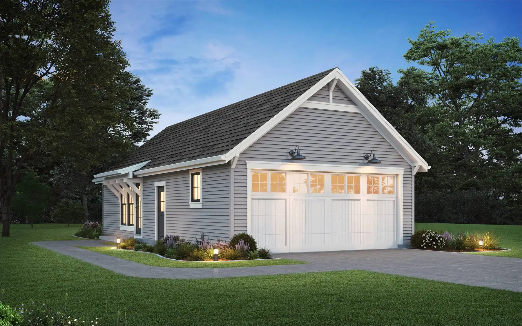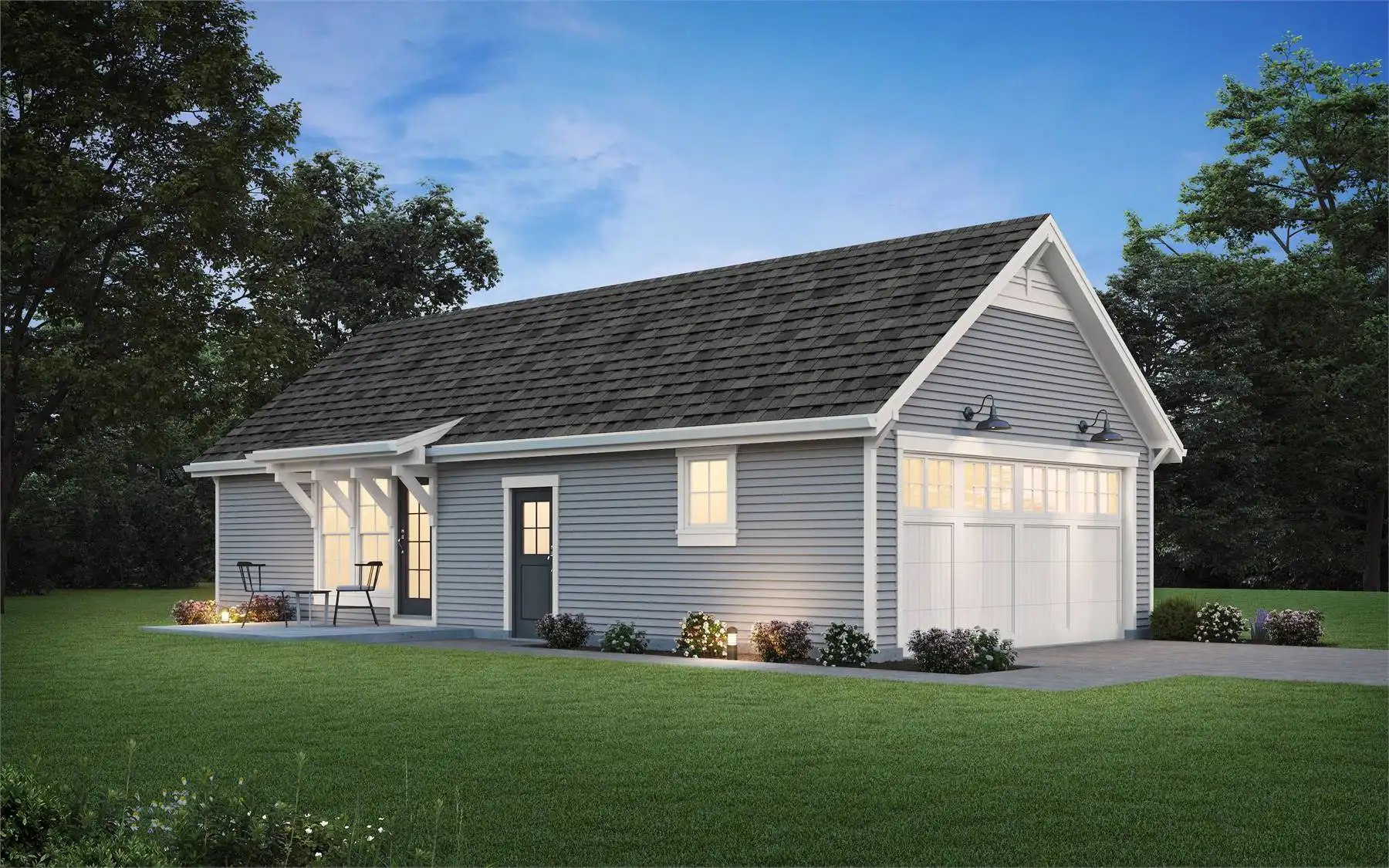 Explore an optimal fusion of cost-effectiveness and practicality in the506 square foot Accessory Dwelling Unit (ADU) with 2-car garage. House Plan 6103 is an adaptable space well-suited for hosting additional occupants in your home, establishing an autonomous guest suite, or cultivating extra income through an independent rental unit. Highlighting a fully furnished kitchen harmoniously blending into an open floor plan that links the living and dining spaces, this ADU presents a pragmatic and impressive option. Featuring a roomy bedroom complemented by an attached full bathroom, this unit encapsulates both convenience and sophistication.