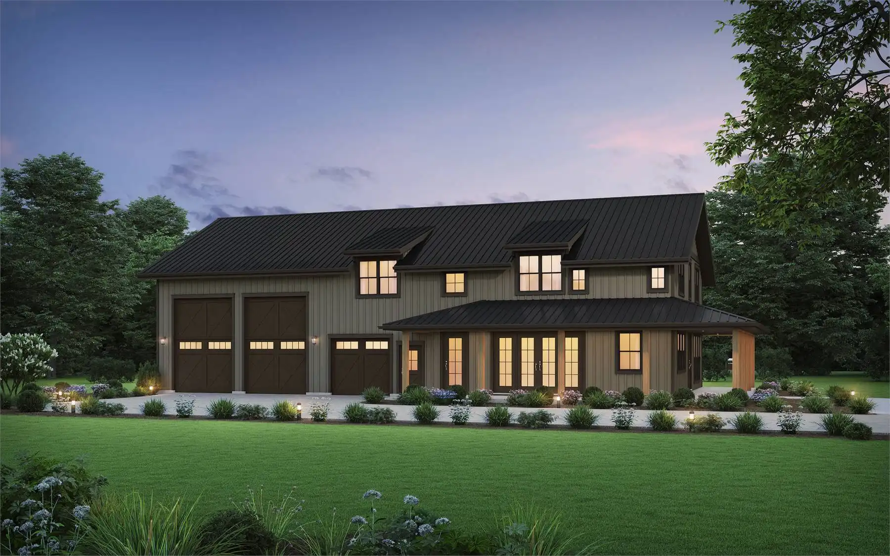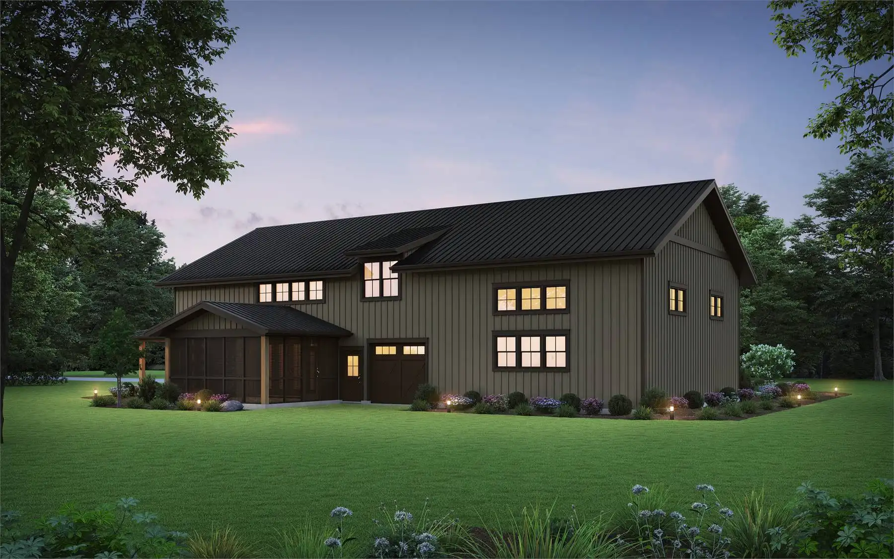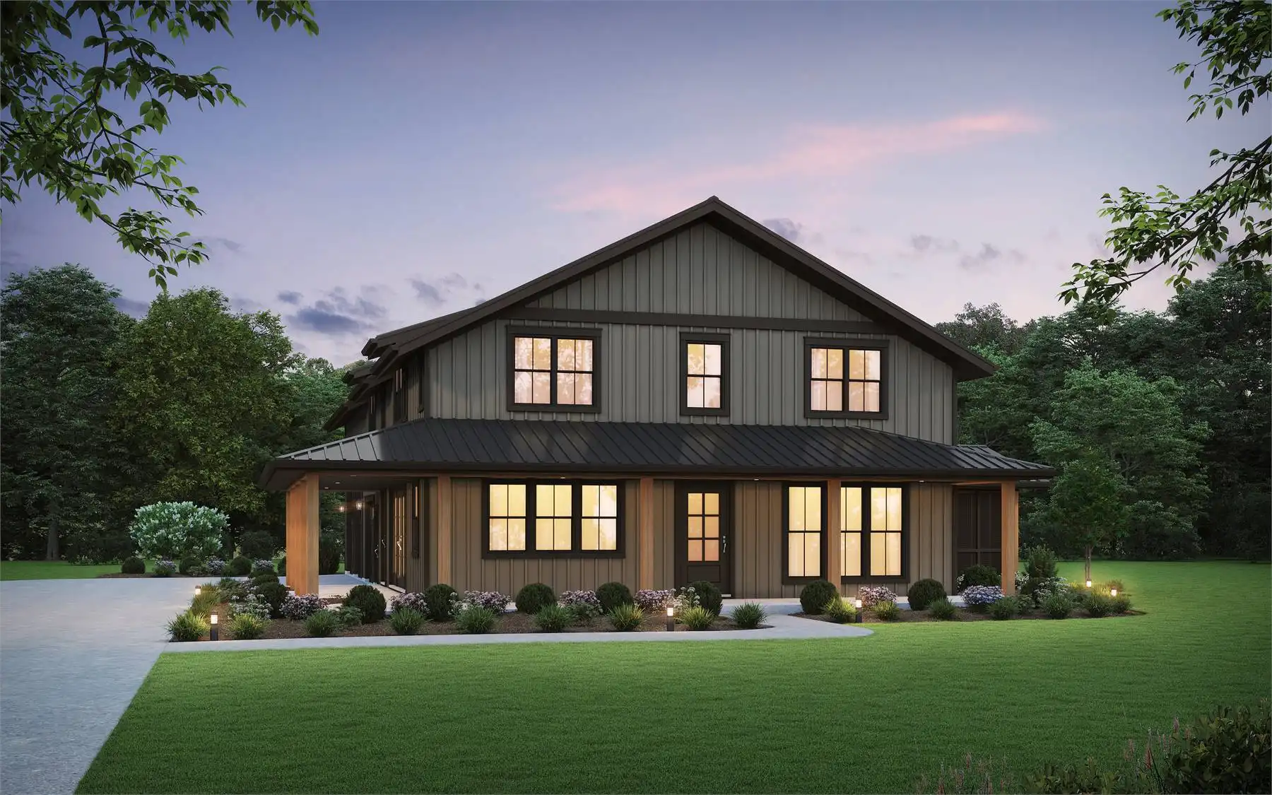 Immerse yourself in the harmonious blend of contemporary comfort and rustic allure embodied by House Plan 6197. Greeted by an expansive wrap-around porch, covered for optimal outdoor pleasure, your journey commences in the foyer. This entrance immediately unfolds into a two-story entertainment space with access to a second screened-in porch as well as the wrap-around porch, creating a captivating area for various hosting opportunities. Flowing seamlessly into the open-plan kitchen, featuring an island and a walk-in pantry, alongside a generously sized dining area, this space is designed for both practicality and style. Ascending upstairs reveals two bedrooms and the master suite, each boasting its own full bathrooms, conveniently situated near the centrally located laundry room. The master suite stands as a private sanctuary, showcasing a spacious walk-in closet and an ensuite with a double vanity sink area, complemented by an exquisite separate tub and shower. Returning to the first floor, a strategically positioned mudroom, accessible from an outdoor entrance and the dining room, guides you into an exceptional 7-car garage. This versatile garage not only provides ample space for your vehicles but also offers a multitude of storage options, culminating in the seamless integration of style and functionality in this barndominium style residence.