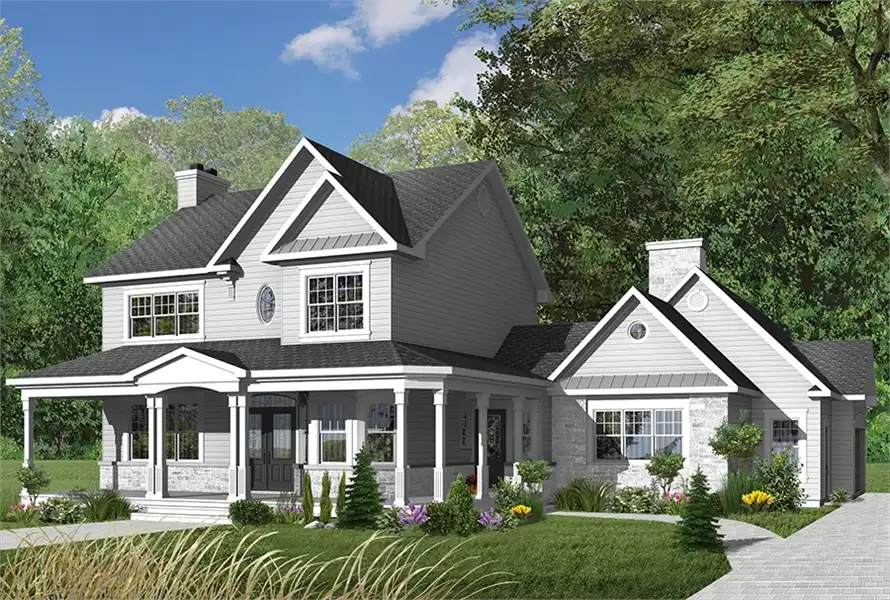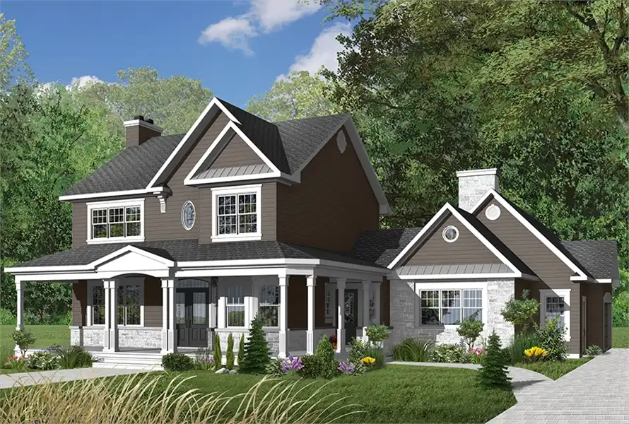 Spacious front and service entrances, home office, living/dining rooms with central fireplace, laboratory-type kitchen with central island lunch counter, family room with fireplace. Master bedroom suite with walk-in closet and private bathroom, two secondary bedrooms, shower room, laundry facilities, bonus space above garage. 3-car garage Unfinished daylight basement, other foundation options available.