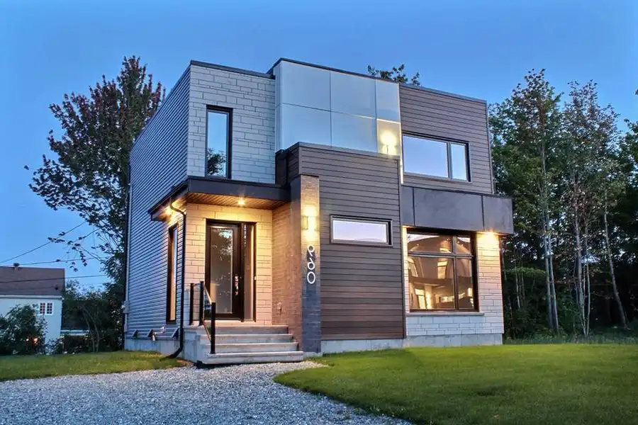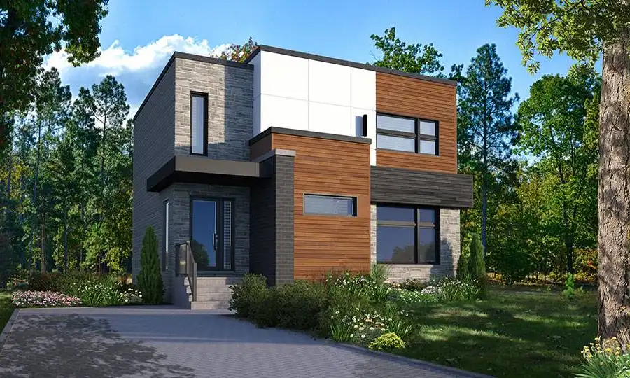 2 story modern and cubic style home plan with 3-bedrooms and splendid kitchen New unique and clean look, and is yet very affordable. This contemporary 2 story home plan has a total of 1,680 square feet as well as an unfinished basement that can eventually be arranged to suit your future needs, also counts 3-bedrooms on the second level. On the main level, the main entrance offers a spacious walk-in type closet that is adjacent to a very practical laundry room as well as a half bath that is conveniently secluded from the other rooms. The kitchen, open to the dining room area has a lots of counter space, a spacious pantry as well as a central island able to easily seat 4. A patio door has been conveniently located in the dining room area and leads to the back porch that offers lots of natural light. Upstairs, the master bedroom is large in size and can easily accommodate a king size bed and extra furniture. In addition it has a large walk-in closet. One of the secondary rooms also offers a walk-in closet and the other bedroom has an integrated work desk. A linen closet is located near the large family bathroom that offers a large shower and a separate bath. The basement is unfinished and may eventually, at the appropriate time, provide additional bedrooms, a playroom or any other room required to add comfort to your family.