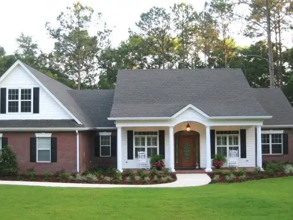 Elegant round columns"dress up" this three bedrooom, three bath, southern country porch design. It's classic irresistable styling makes it perfect for almost any neighborhood. The large vaulted family room, enormous country kitchen and it's 452 square foot bonus area make this home feel so much more spacious than one might expect of a 2097 square foot design.