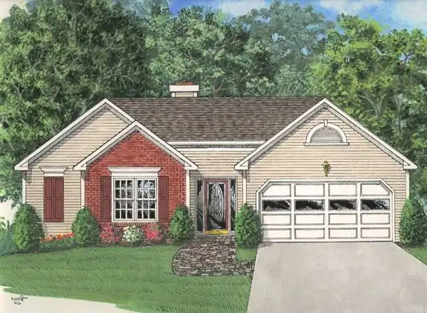 This strikingly attractive compact home is affordable, yet full-featured. The beveled glass front door provides a luxurious entry into the foyer. You'll be impressed with the 16' by 20' family room with it's vaulted ceiling. The open kitchen/dining area offers an optional bay for additional space. The master suite in this split bedroom plan is truly the highlight of this design. There are his and hers closets, a vaulted bath with an elegant corner tub, separate vanities, and a shower.