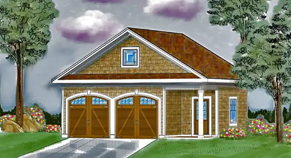 This lovely detached structure provides an ample two car garage as well as generous storage or workshop space. The attractive porch would be located closest to your house.