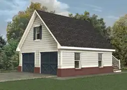 Two cars will fit nicely into this detached garage. Outside stairs lead up to a sizable space on the upper floor. How about using this space as an art studio or a playroom? Teenagers can make loud music without disturbing other family members.