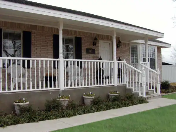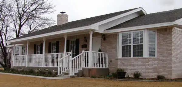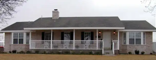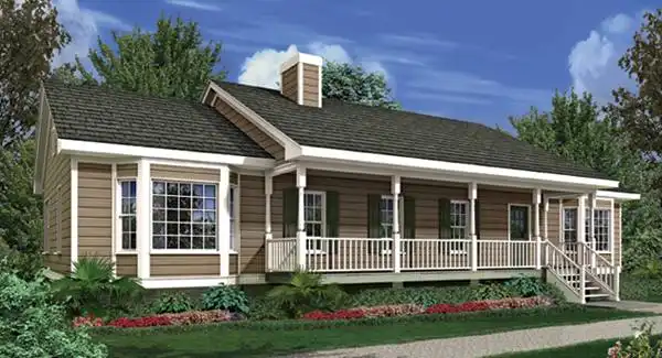 Simply country describes this front porch, split bedroom design. The living area is highlighted by a modified cathedral ceiling framing the mantle of the fireplace at one end of the living area while at the opposite side of the room is a wonderful furniture niche. A boxed bay in the breakfast and dining rooms adds just that extra bit of floor space. The kitchen features a peninsula counter and built-in pantry. Bay windows give additional light and space to the master and front bedrooms. The master bath has a dramatic garden tub and double vanity while the shower and commode share a private wet area. The secondary bedrooms share a compartmentalized hall bath and conveniently located laundry room. The rear entry leads to the back deck and yard providing the perfect connection to a detached garage.
