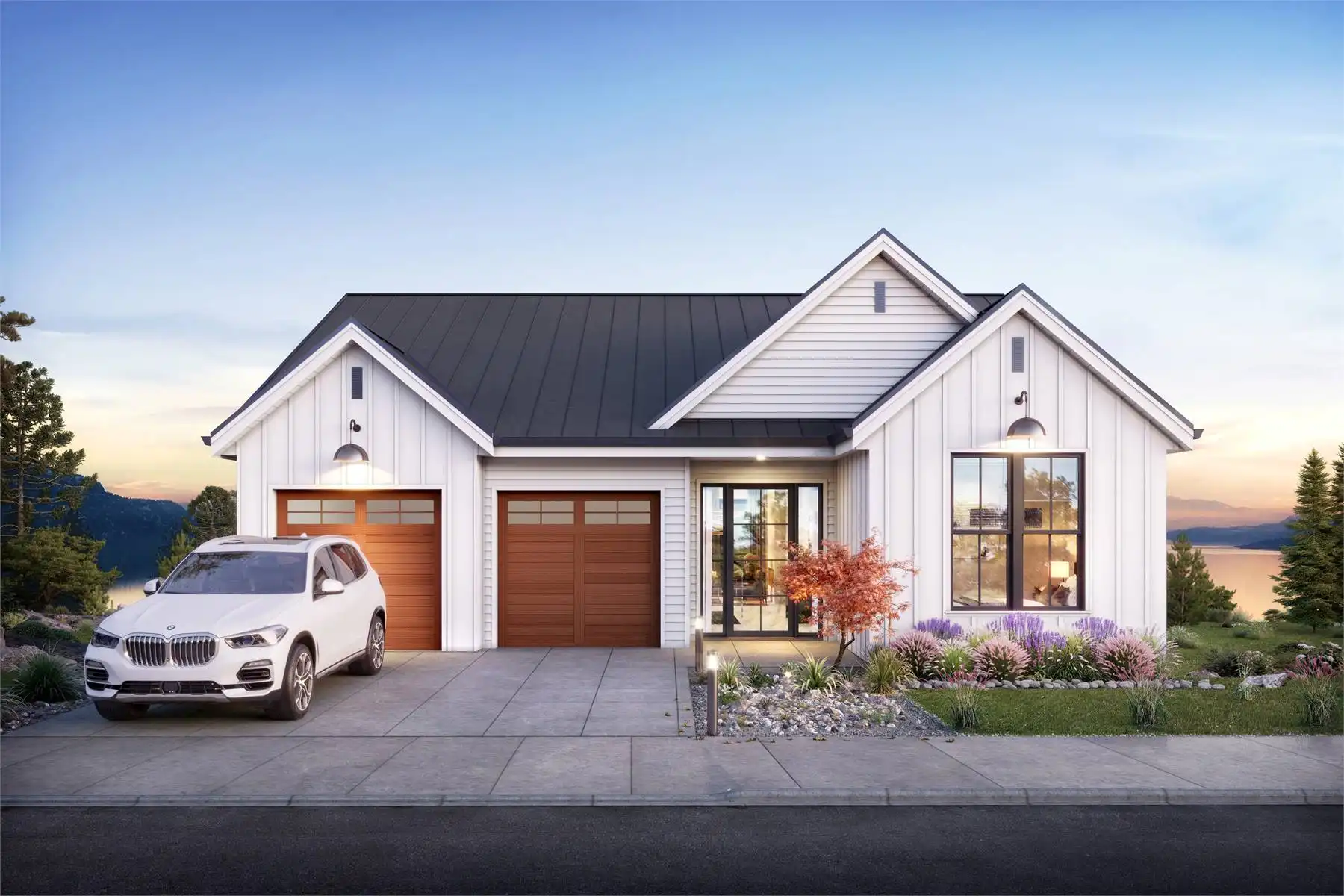 Discover House Plan 6360, a charming, well-designed 3,144 square foot contemporary farmhouse. This four-bedroom, two-and-a-half bathroom home welcomes brightness with its large windows and inviting wood exterior. Upon entry, a spacious foyer beckons, guiding you seamlessly through the home. To the left, a conveniently located den provides a perfect space for a home office, while nearby, a dedicated laundry room adds practicality to daily life. As you continue, an open floor plan unfolds, revealing a generously sized living room seamlessly connected to a covered deck that effortlessly blends indoor and outdoor living.The beautiful L-shaped kitchen, featuring a large island with seating, overlooks both the living space and a designated dining area. On the back left side of the house, the secluded master bedroom boasts an ensuite with double vanity sinks, a separate shower, a soaker tub, and a spacious walk-in closet. Downstairs, a centrally located rec room offers an ideal private space for kids to entertain themselves. Three bedrooms and large covered patio complement the lower leverl floor plan.