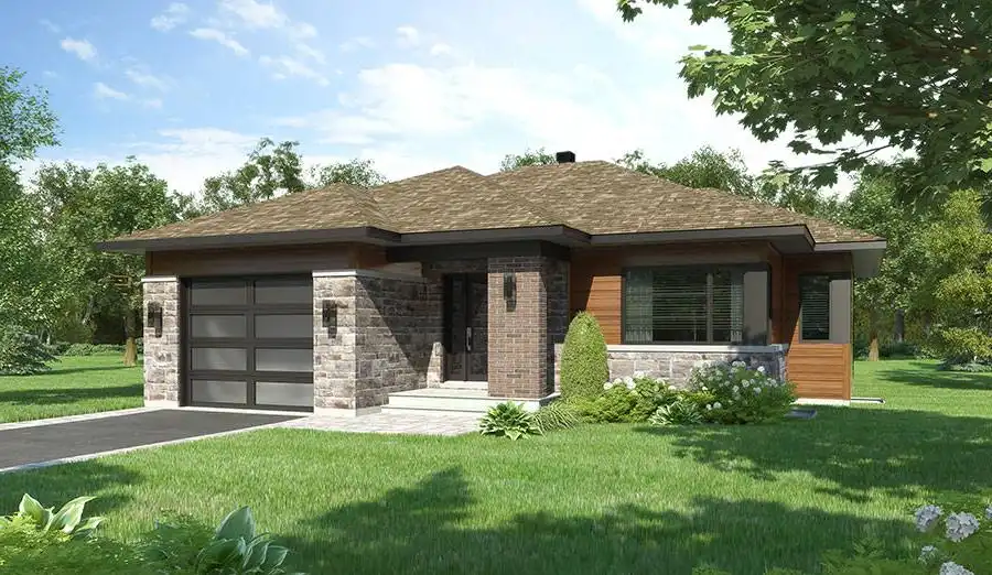 Modern one floor home plan with garage. Outside, on the main façade, a mix of stone and wood provide an attractive and timeless look, while inside a welcoming entrance leads onto an activity area completely open (kitchen, dining and living room open concept) and overlooking the backyard. Modern house plan # 3289 also offers plenty of amenities like the main entrance with coat closet and access to the garage, this remarkable kitchen with pantry, excellent storage and central island-lunch area. Also not to be missed is the spacious living and dining area with plenty of windows, two good sized bedrooms and a bathroom with independent shower stall that is much appreciated by the new owners.