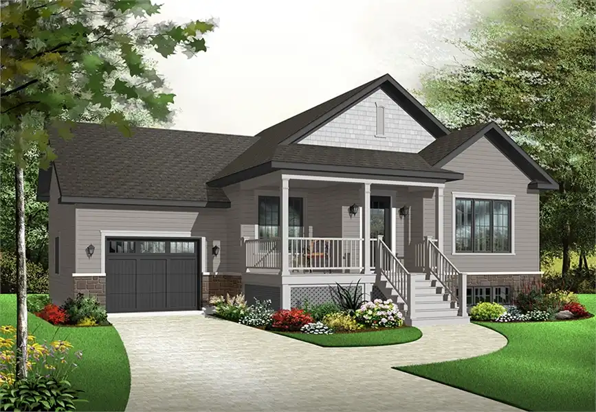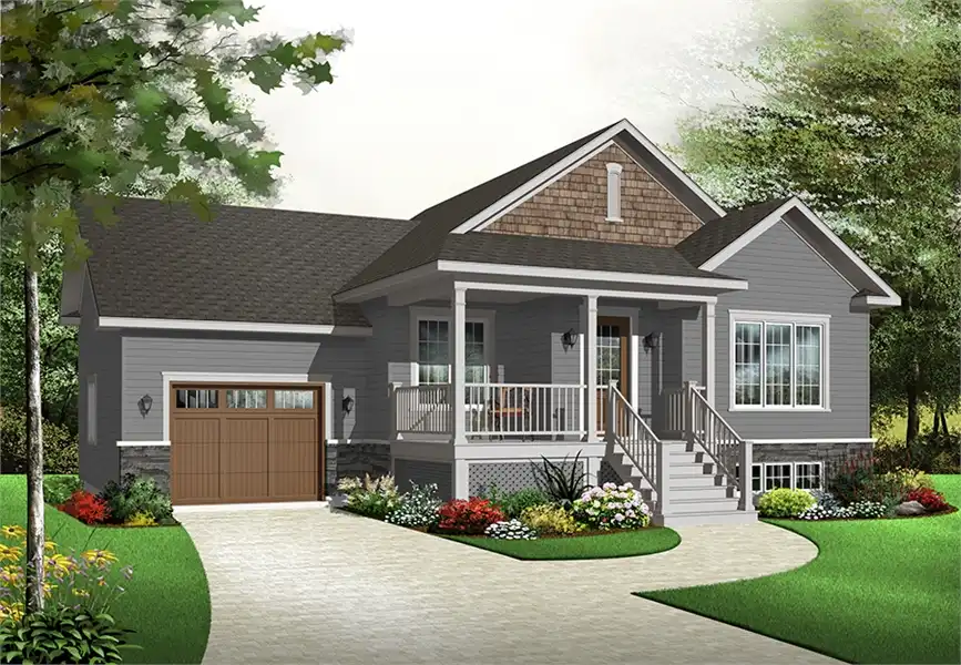 Ideal first-home buyer house plan with 1,023 square foot of living space, 2-bedrooms, one-car garage, 2 good size bedrooms, laundry closet on main floor, full family bathroom, nice kitchen, dining and living room concept. Daylight basement (unfinished), and other foundation options available. The basement would add extra space in the future for a growing family or expansion.
