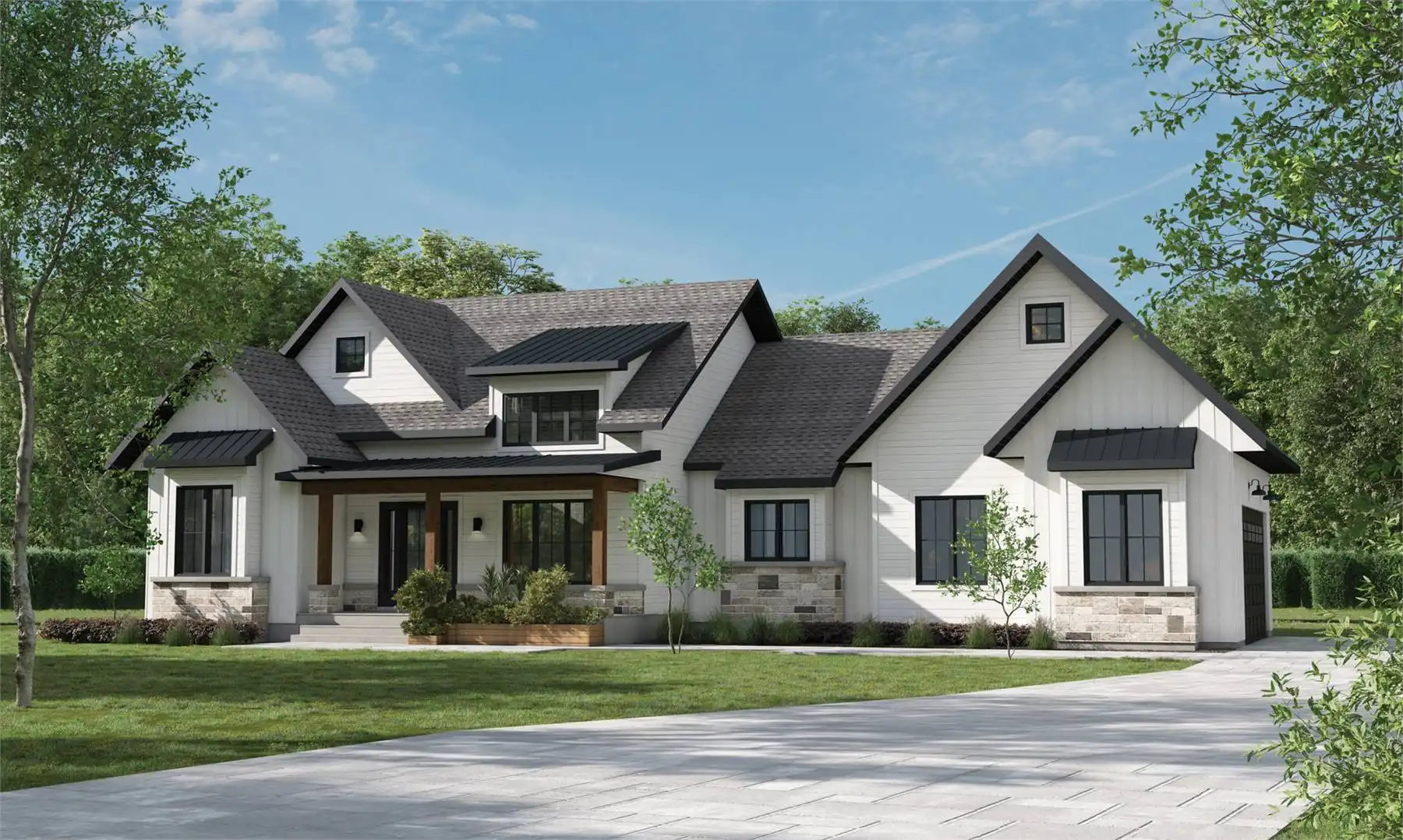 Discover this charming singe story modern farmhouse, spanning 1,729 square feet, showcasing a carefully planned arrangement of separated bedrooms. As you approach, the seamless fusion of modern aesthetics and rustic allure invites you into a residence where open spaces and a warm ambiance effortlessly come together. The core of the home reveals an inviting open floor plan, highlighted by a beautifully appointed kitchen showcasing a spacious island with seating, creating a connected atmosphere for family gatherings. Unwind in the living room, where a smooth transition to the covered rear patio enhances the indoor-outdoor flow. On one side of the house, two bedrooms and a full bathroom offer a secluded retreat, ensuring privacy. On the opposite side, explore the split master bedroom adorned with an elegant ensuite, featuring a double vanity sink and a separate tub and shower for added luxury. A generously sized mudroom leads to the convenient 2-car garage, achieving the ideal blend of functionality and style in this modern farmhouse.