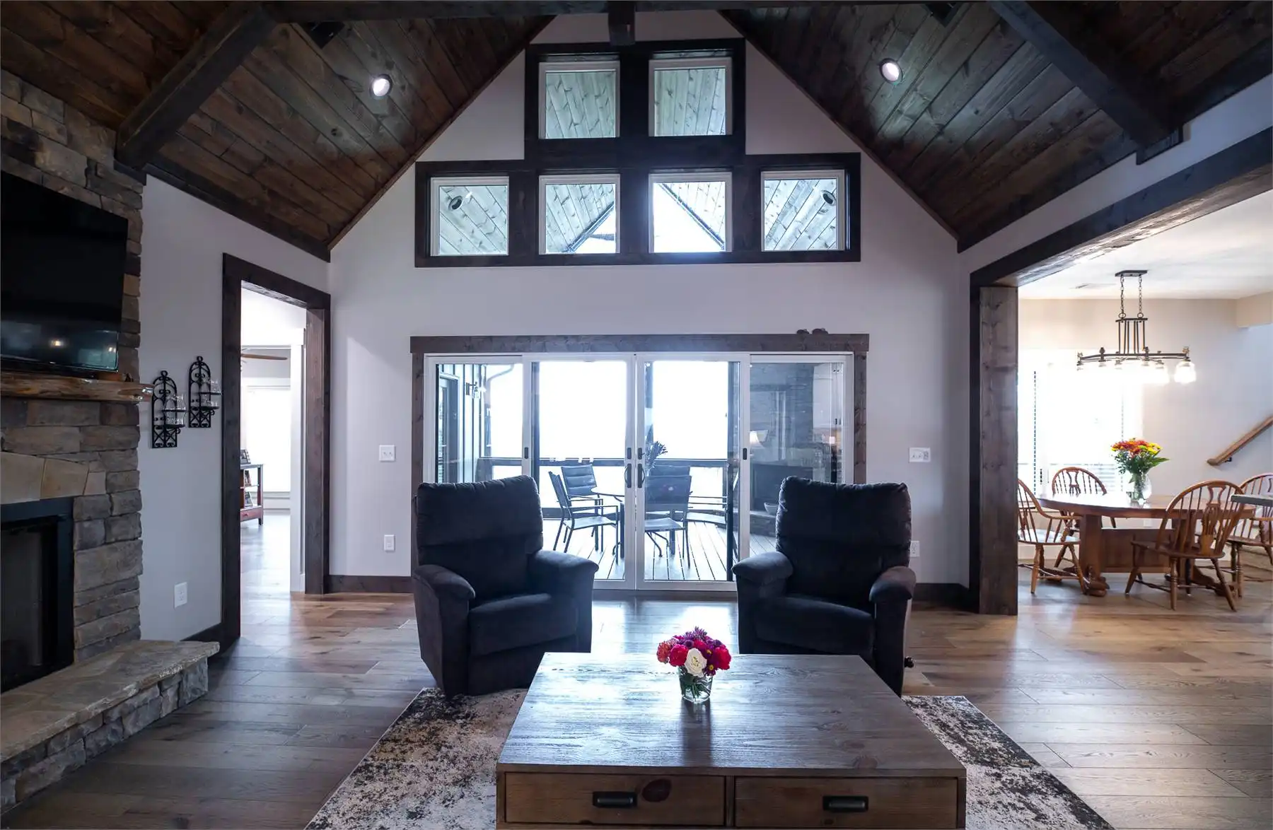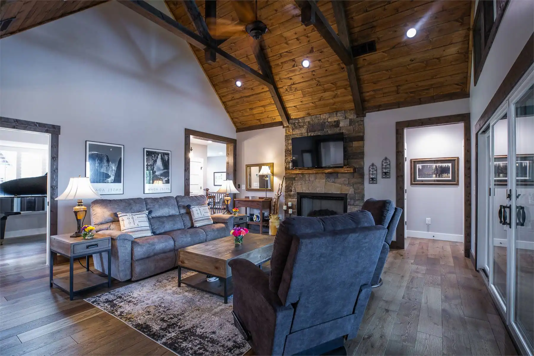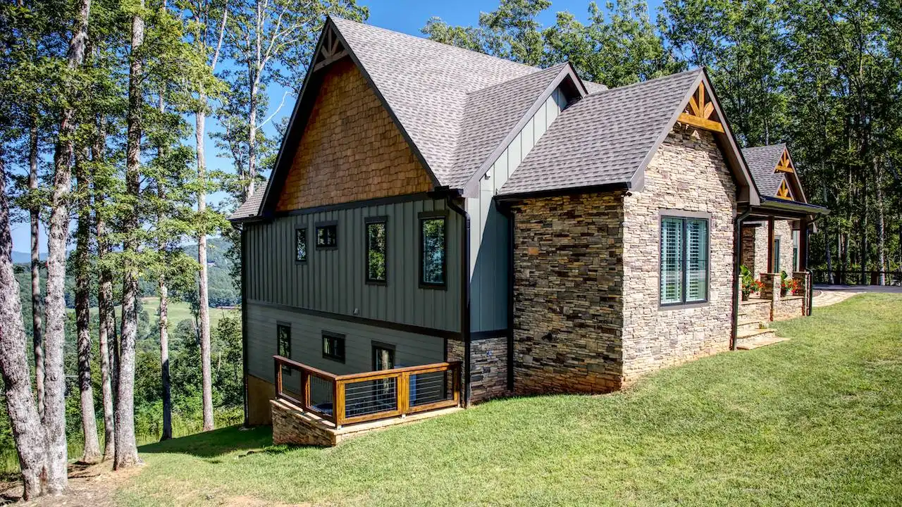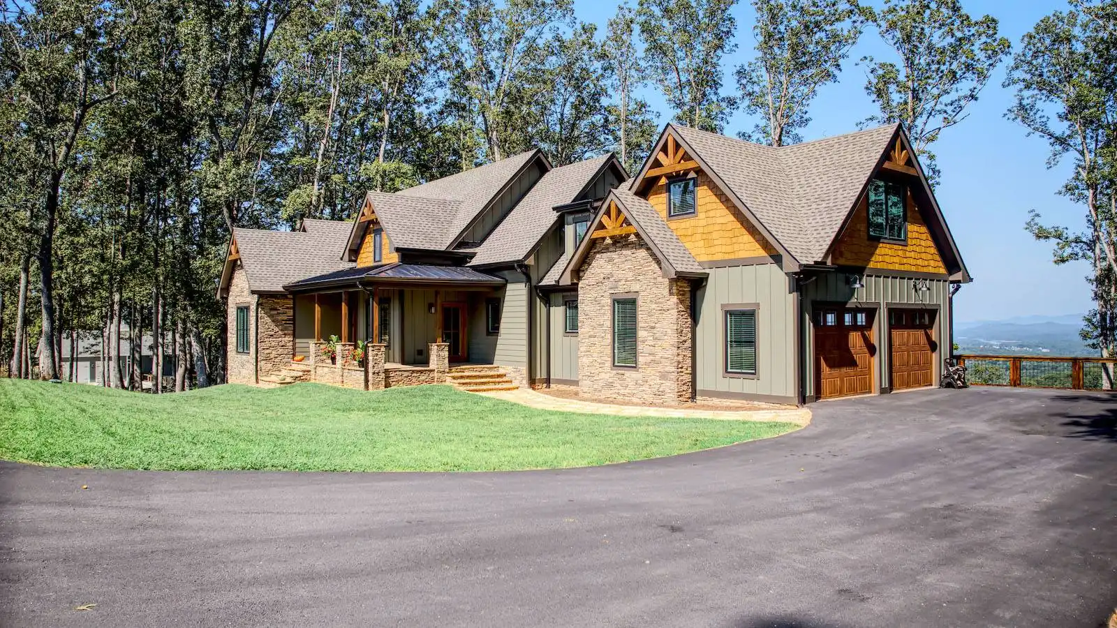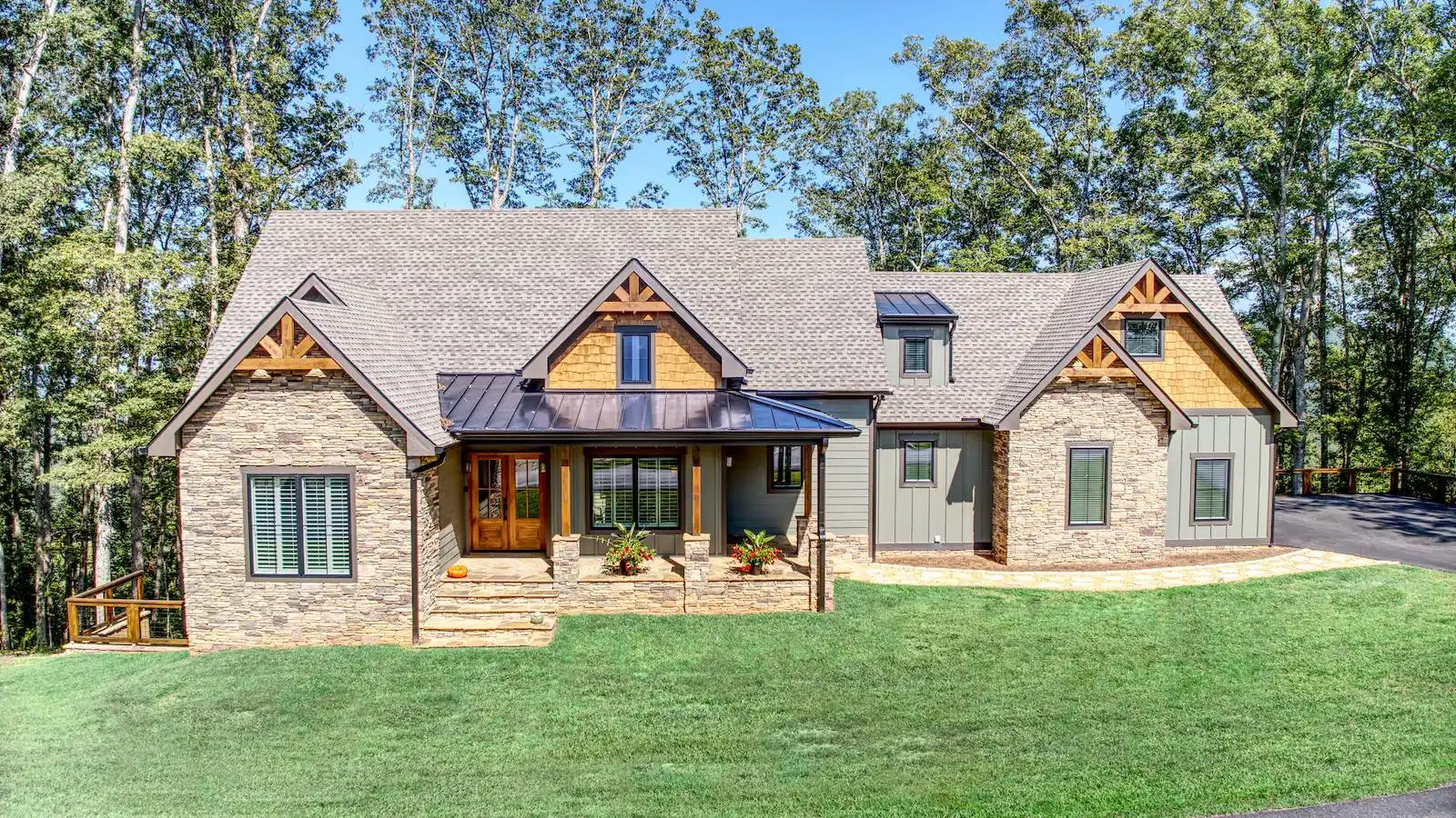Introducing House Plan 6366, a 3,917-square-foot mountain home with Craftsman features. This unique design seamlessly integrates with its natural surroundings with beautiful wood and stone exterior elements. As you step through the spacious covered porch, a welcoming foyer leads to a large family room with captivating views and expansive outdoor living spaces. The open-concept layout enhances the home's beauty, ensuring fluid movement between the frequently used spaces. The well-designed kitchen provides ample storage and counter space. On one side of the main level, you'll find the master bedroom, ensuite bath, and a den, all of which create a true private oasis. The basement floor plan caters to family activities with a rec room, family room, theatre, two additional bedrooms, and a shared bathroom. Designed for a sloping lot, the walk-out basement features a patio for added outdoor enjoyment. Completing the tour, a bonus space above the two-car garage adds flexibility for accommodations.