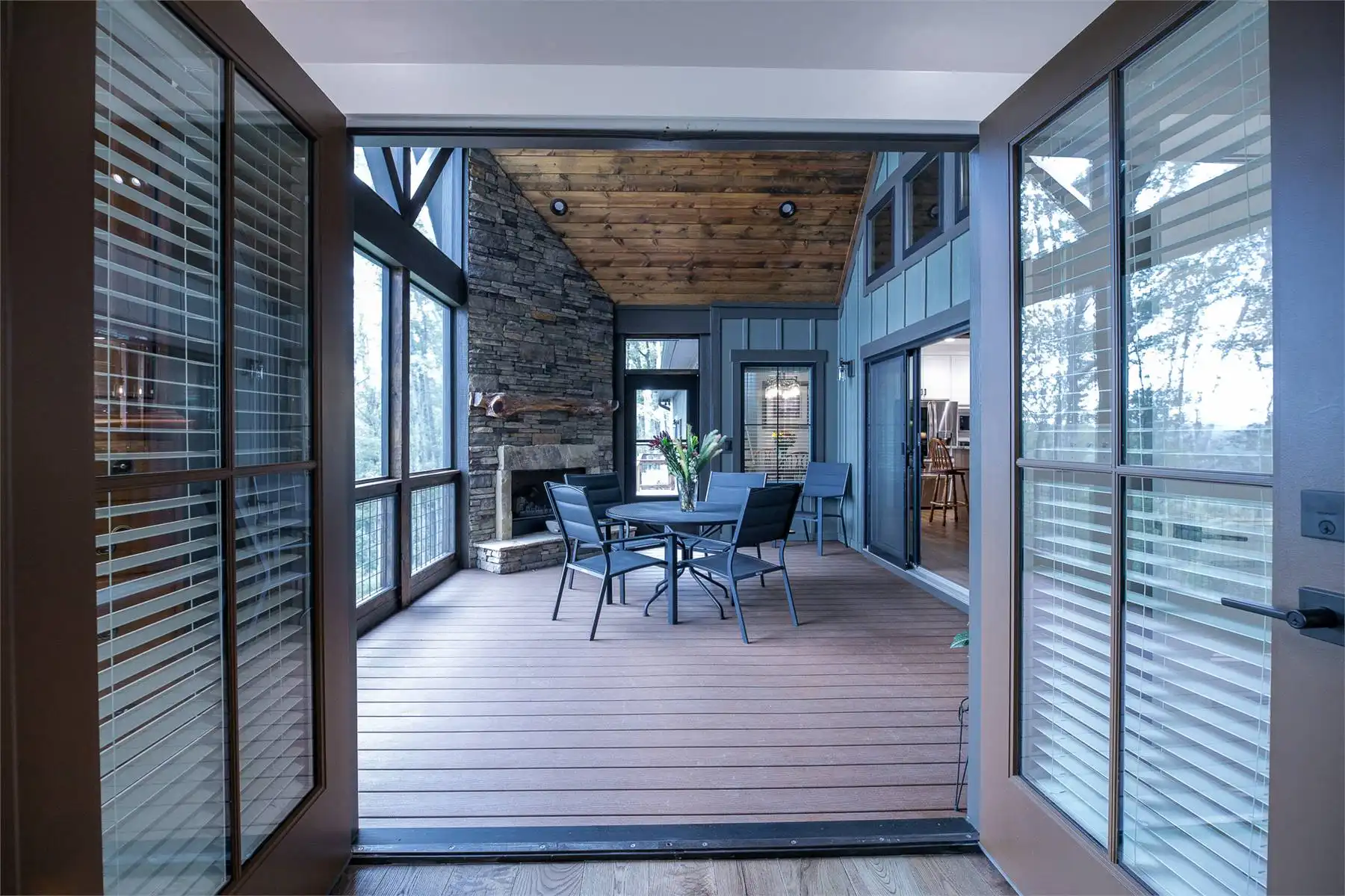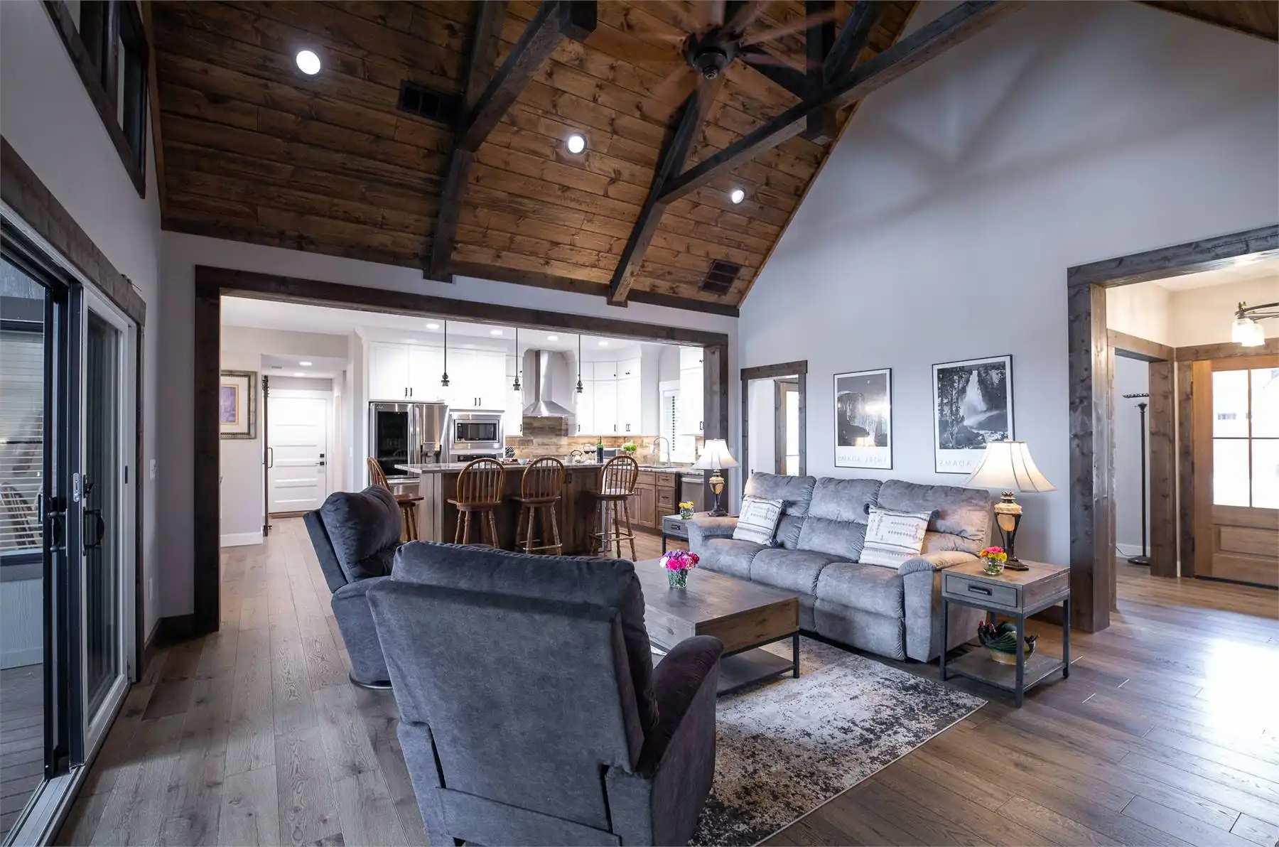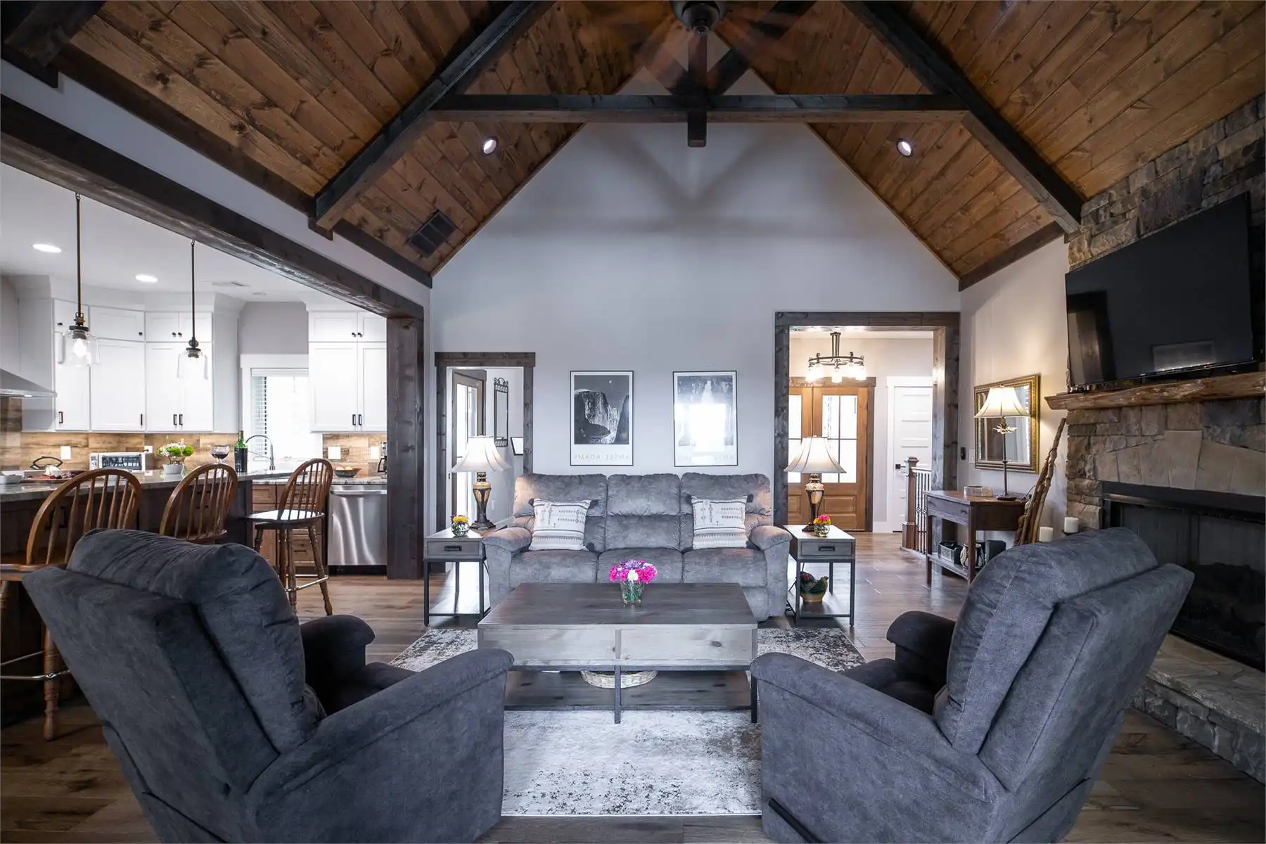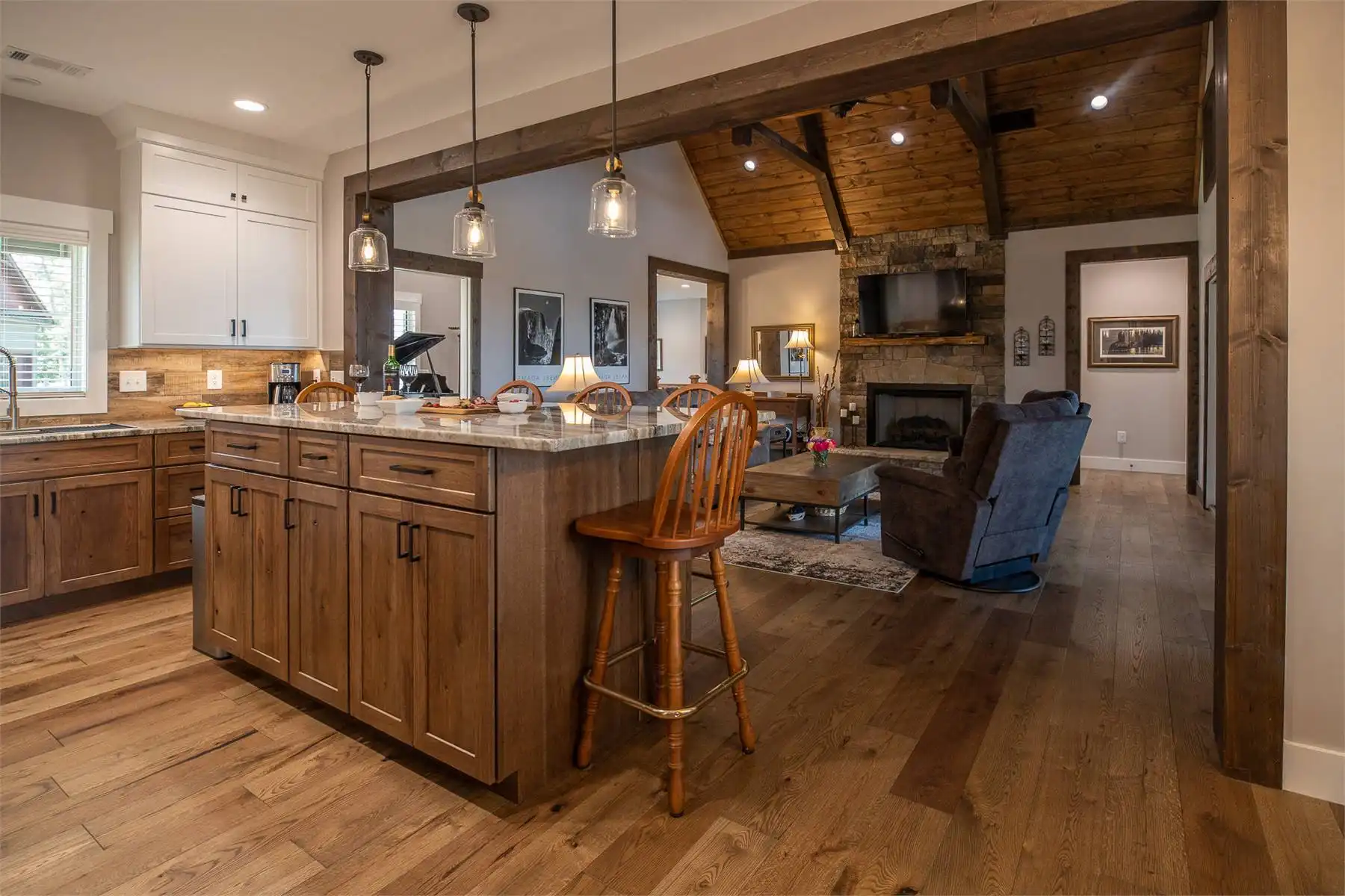 Introducing House Plan 6366, a 3,917-square-foot mountain home with Craftsman features. This unique design seamlessly integrates with its natural surroundings with beautiful wood and stone exterior elements. As you step through the spacious covered porch, a welcoming foyer leads to a large family room with captivating views and expansive outdoor living spaces. The open-concept layout enhances the home's beauty, ensuring fluid movement between the frequently used spaces. The well-designed kitchen provides ample storage and counter space. On one side of the main level, you'll find the master bedroom, ensuite bath, and a den, all of which create a true private oasis. The basement floor plan caters to family activities with a rec room, family room, theatre, two additional bedrooms, and a shared bathroom. Designed for a sloping lot, the walk-out basement features a patio for added outdoor enjoyment. Completing the tour, a bonus space above the two-car garage adds flexibility for accommodations.