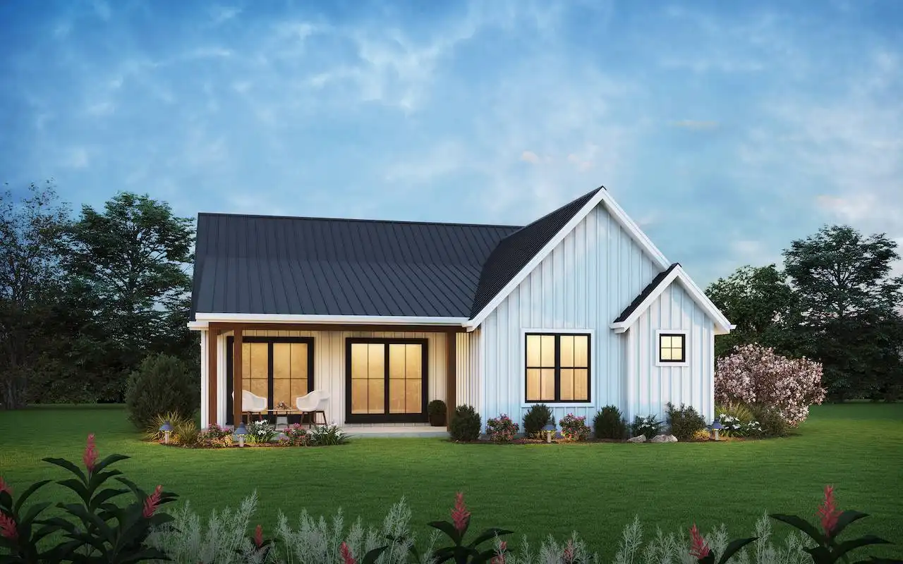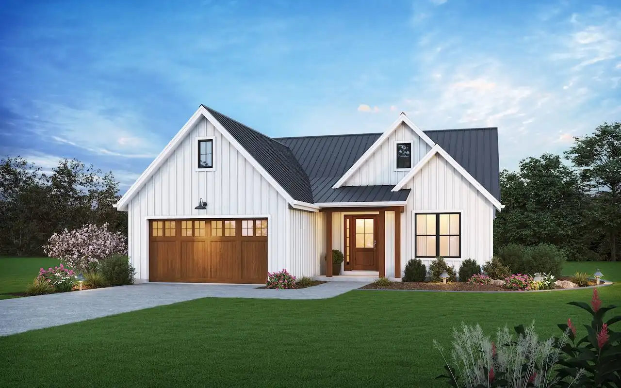From the blend of the dark metal roof, board and batten siding, and timber garage door and accents, charm isn’t lacking nor is functionality forgotten.