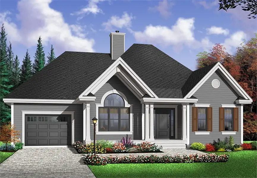 This modern ranch style house plan has 1,186 square foot, 2-bedrooms, 1 bath, and one-car garage with a large covered front porch. One of the beautiful features is the lovely living room and dining rooms with a see-thru fireplace. Cathedral ceiling in living room make for a larger volume in the room. The cozy kitchen with lunch counter, makes for a great area fr conversation. With two bedrooms, one of which has a walk-in closet, this home is made for empty-nester's, or a starter house. Inside the bathroom is a separate shower and dual sinks. The unfinished daylight basement, makes for more space in the future if need arises.