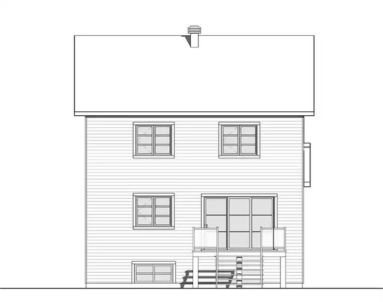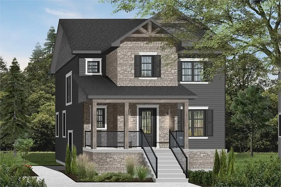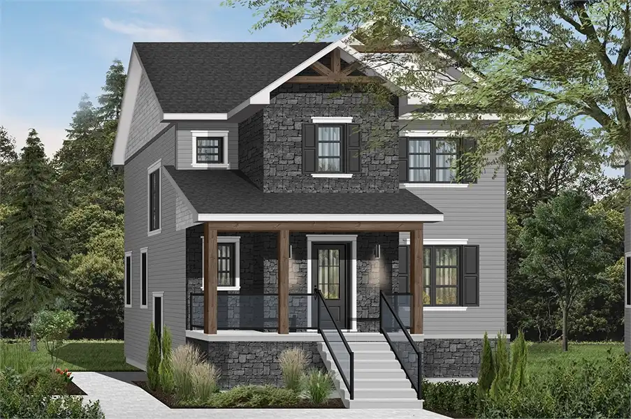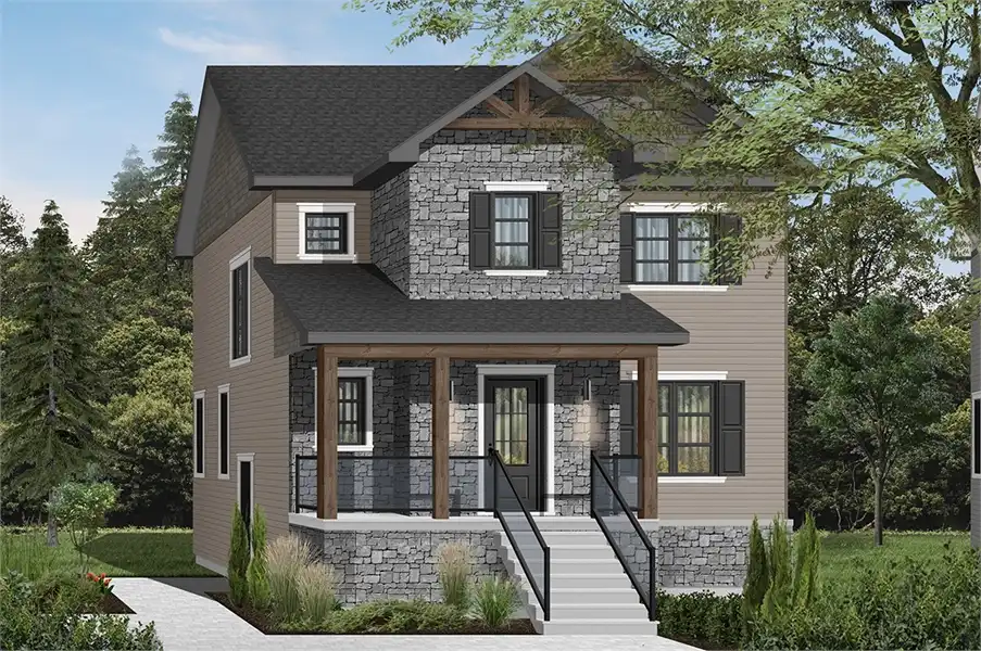 This transitional style house plan (a fashionable style to express that it borrows traits with traditional and rustic styles at the same time) will be perfect for your narrow lot! Indeed, with its 28 ' wide, it can accommodate small lots and low construction budgets. In addition, wood accents in the cornices and on the front balcony bring a rustic touch to this traditional style house with dark shutters.  The front entrance vestibule is closed and offers a wardrobe and a sitting area (chair or entry bench). Furthermore, access to the house is done through pocket doors so as to not clutter the access to the bathroom and adjacent laundry room. The latter offers a practical washer / dryer combo on the ground floor, as well as a corner toilet / vanity. Just far enough from the family areas, for quick and discreet access.  The dining room is large and can accommodate a table of at least 8 guests. It is open to the kitchen and offers a large island for 4 people and a gracious walk-in pantry. The living room (lounge or TV room) is also open to the kitchen, allowing for quick communication with the rest of the family during meal preparation. In addition, triple patio doors and two windows bring plenty of natural light to this room.  Also quite noteworthy is the halfway down the stairs to the basement that is a side door to the outside in anticipation of the construction of a future garage.  Upstairs there are three beautifully appointed bedrooms, including a master bedroom with a large walk-in wardrobe and private access to the family bathroom. It offers a large separate shower and bath, a double vanity and a private toilet corner. The two secondary bedrooms also contain a wardrobe of good size. A linen closet is located in the corridor and is very convenient for the storage of bedroom accessories. The basement is to be finished and proposes (in anticipation of the future) space for a shower room as well as a corner storage room. In the future, it will be possible to finish the basement in order to add a playroom, additional bedrooms, a guest bedroom or simply more organized storage space.
