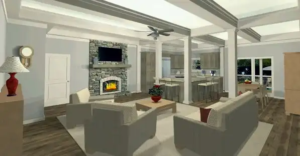 Sturdy columns and gable details lend a Craftsman feel to this attractive house plan, with four bedrooms, three baths and an affordable 1,898 square feet of living space. Invite some friends for good conversation in the spacious family room, at the center of the home plan. The gourmet kitchen features a handy pantry as it serves the versatile dining area. Note the outdoor dining area, complete with a summer kitchen and a movie screen. The fabulous master bedroom offers a walk-in closet, a sitting area and direct access to outdoor areas. The private bath flaunts a garden tub, a sit-down shower and dual vanities. You'll appreciate the location of the office, because you can watch for arriving clients. This room could serve as guest quarters. Builders point out the front and rear porches on this home design, maximizing outdoor relaxation space.