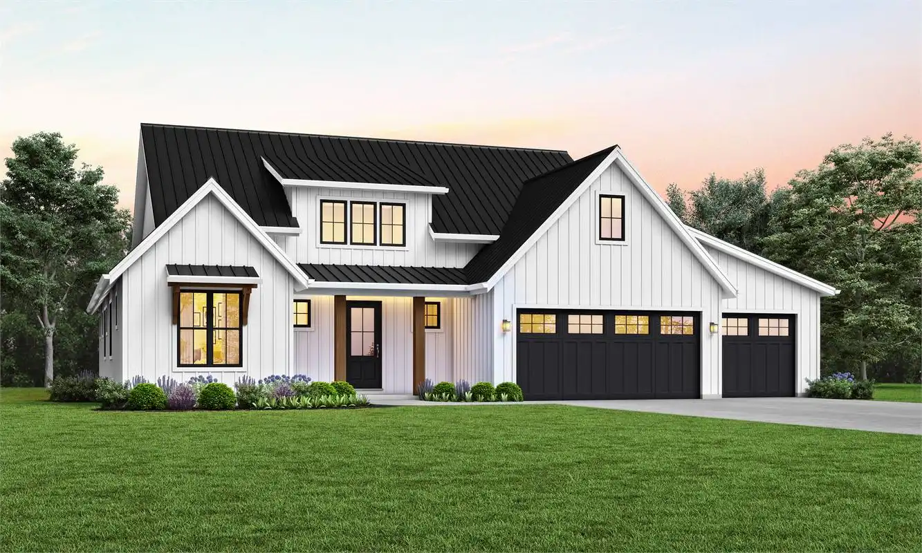 This brand new modern farmhouse is the much anticipated larger version of our best selling DFD-7234. This 2683 two story adds an additional 3rd garage bay and 4th bedroom.