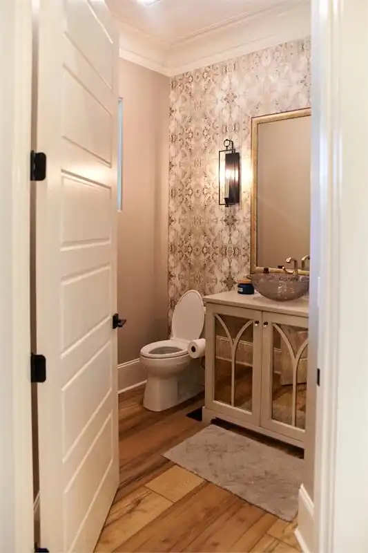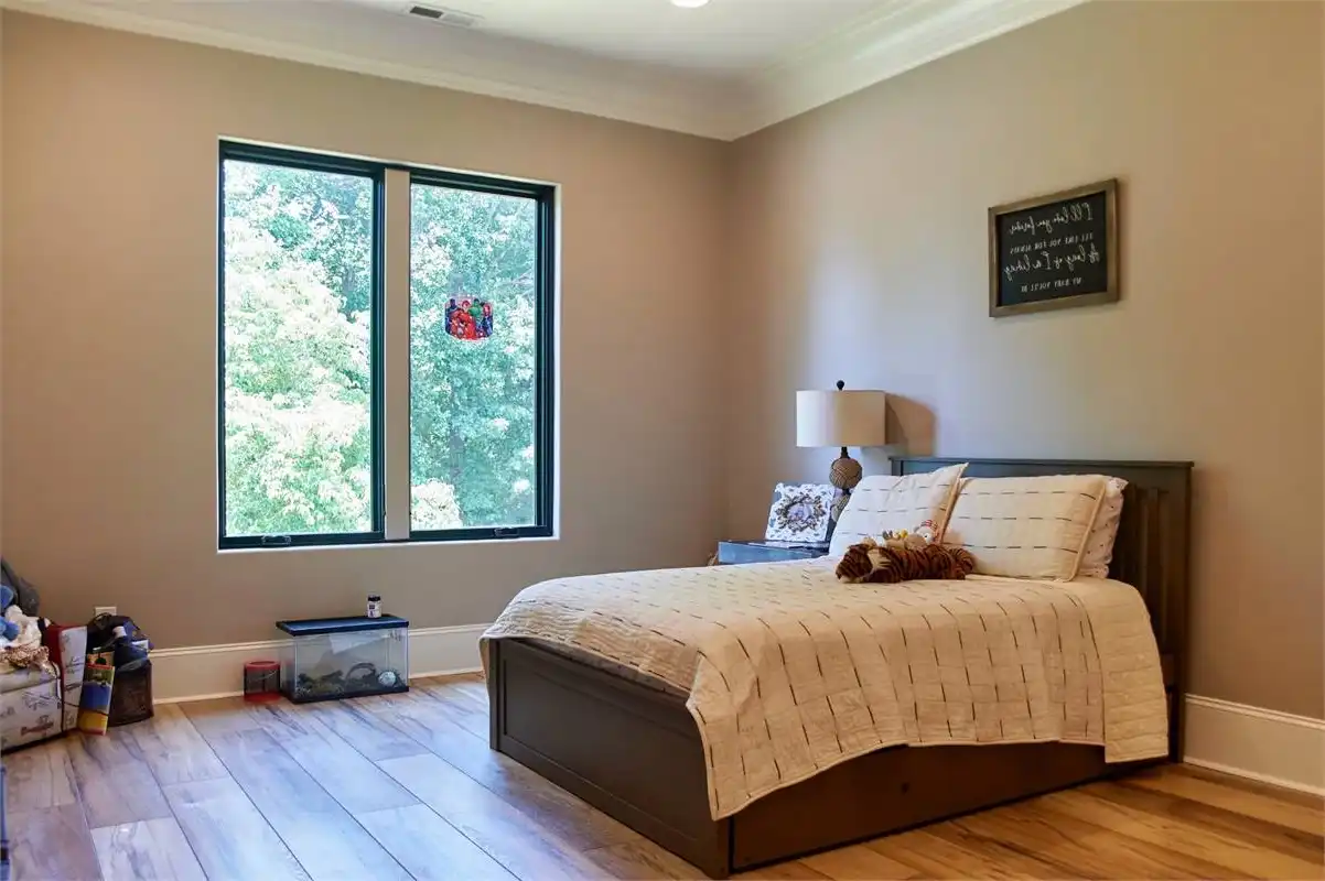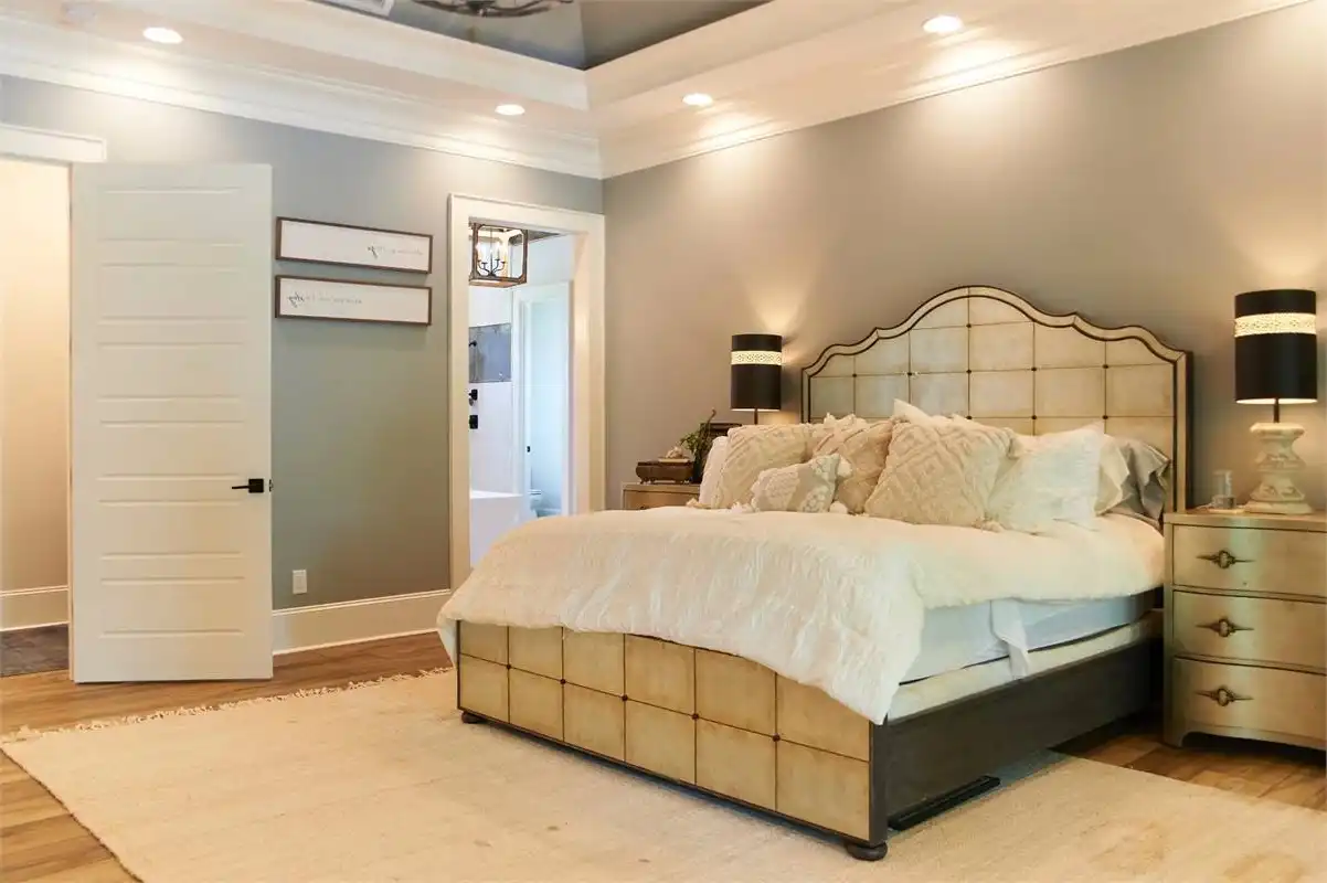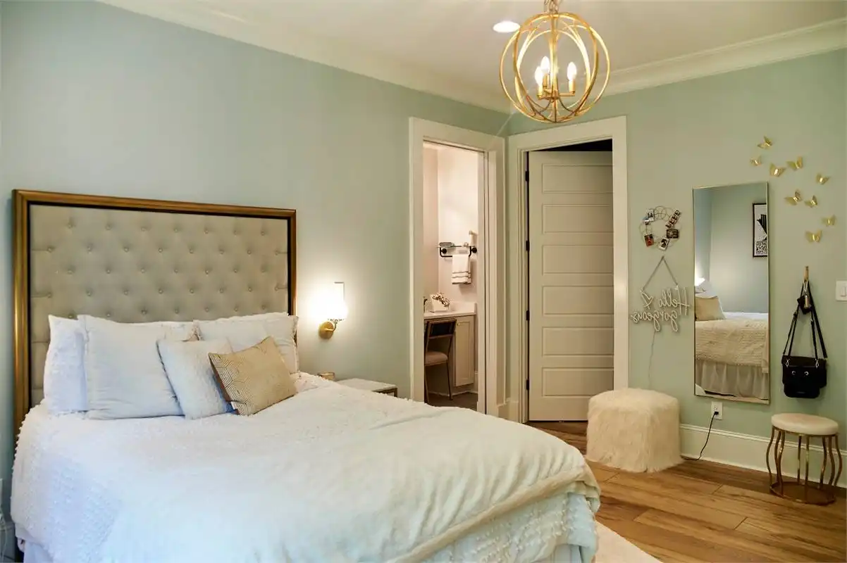 The family’s garage entrance feeds directly into the mudroom helping with organization. The clever door placements allow ease for unloading groceries into the large pantry as well as a drop-off zone for dirty weekend sports uniforms. Both secondary bedrooms are found on the left side of the home and each have their own full shower bathroom and walk-in closets.