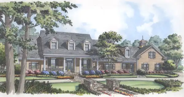 This lovely four-bedroom house design offers Southern charm and Colonial nostalgia. Inside, the den/study could serve as a home office. The central living room is perfect for quiet conversation. The island kitchen serves special dinners in the formal dining room. The casual breakfast nook opens to a covered patio with summer kitchen. A corner fireplace warms the spacious family room. A nearby bedroom would be great for in-laws or guests. Across the home, the master suite boasts patio access and a posh bath. Two more bedrooms are on the upper level. Above the garage, a bonus area offers three different layouts.