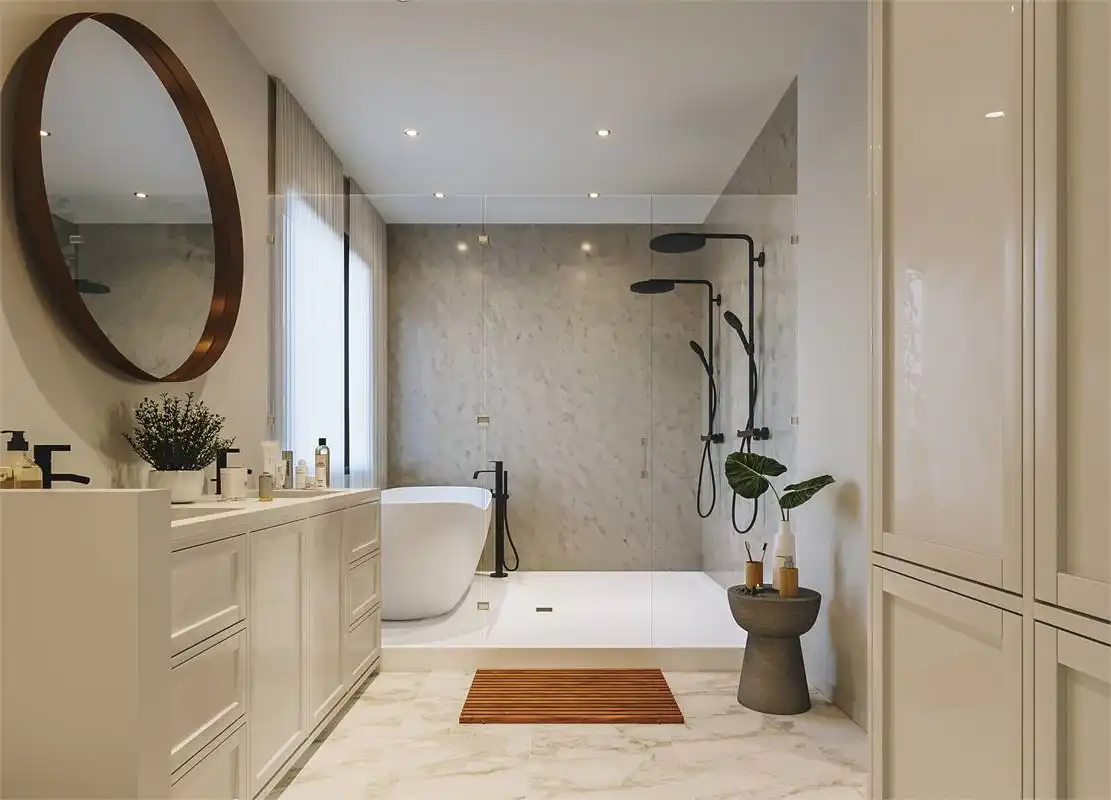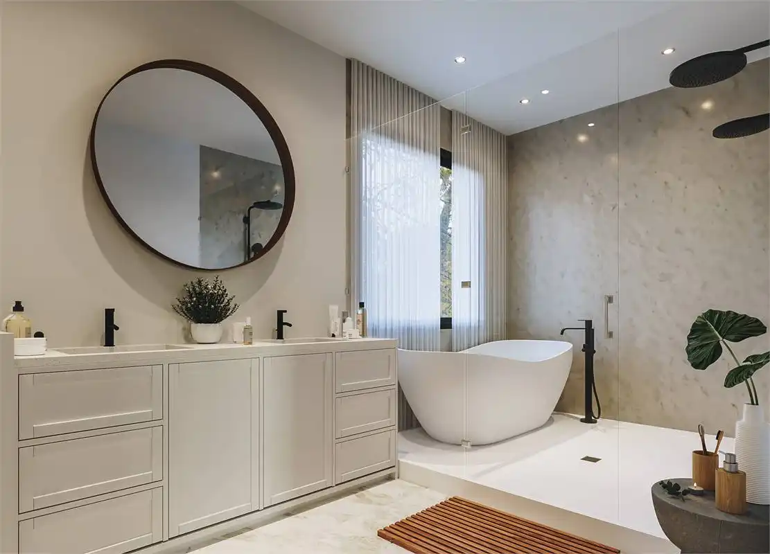 The master retreat and bedrooms 2 & 3 are up the stairs with the secondary beds sharing a hallway shower bath. The master suite claims the entire back of the home with a pass-through closet leading to a spa-like bathroom complete with a “wet bath,” allowing the space for the double head shower to be maximized.