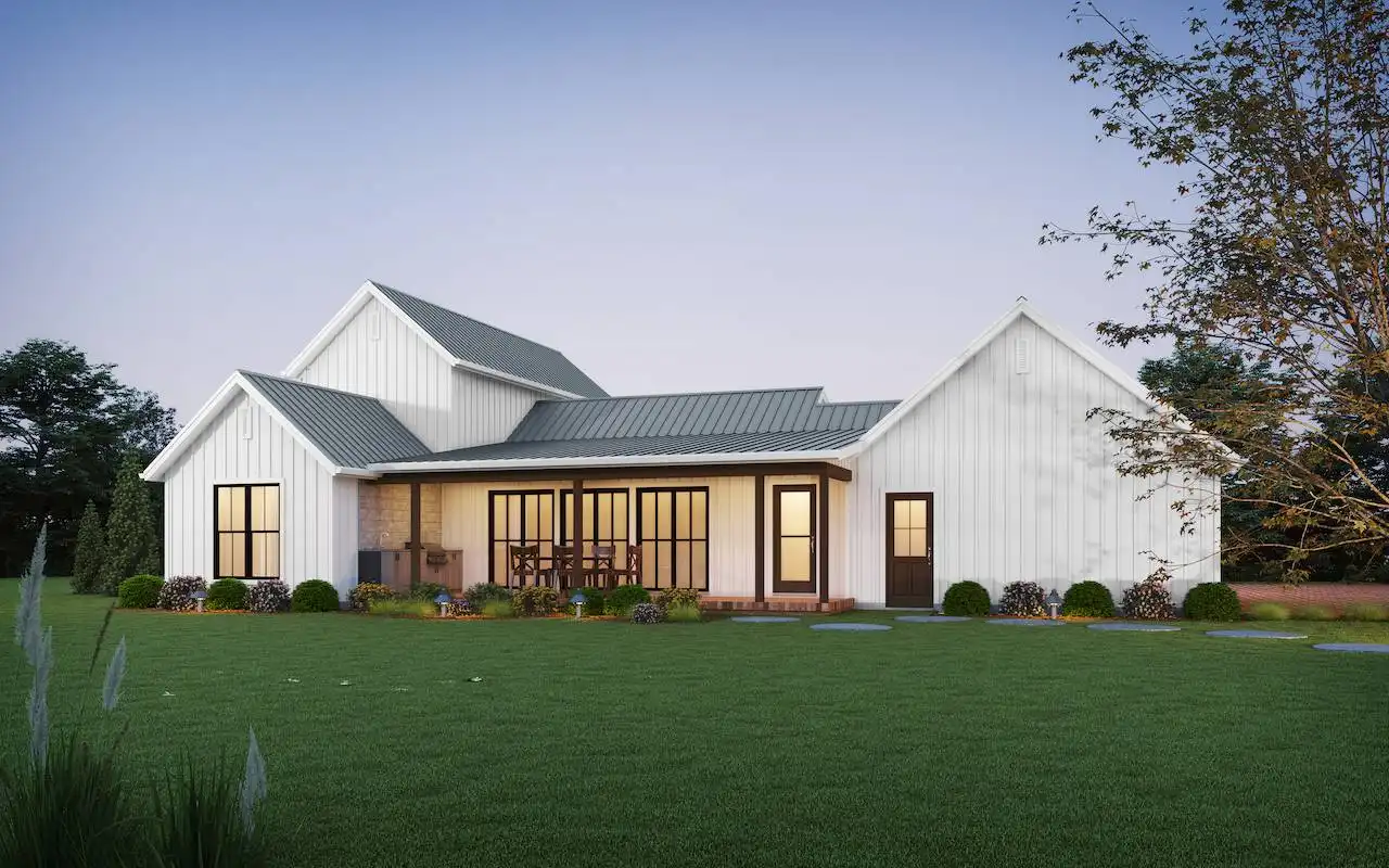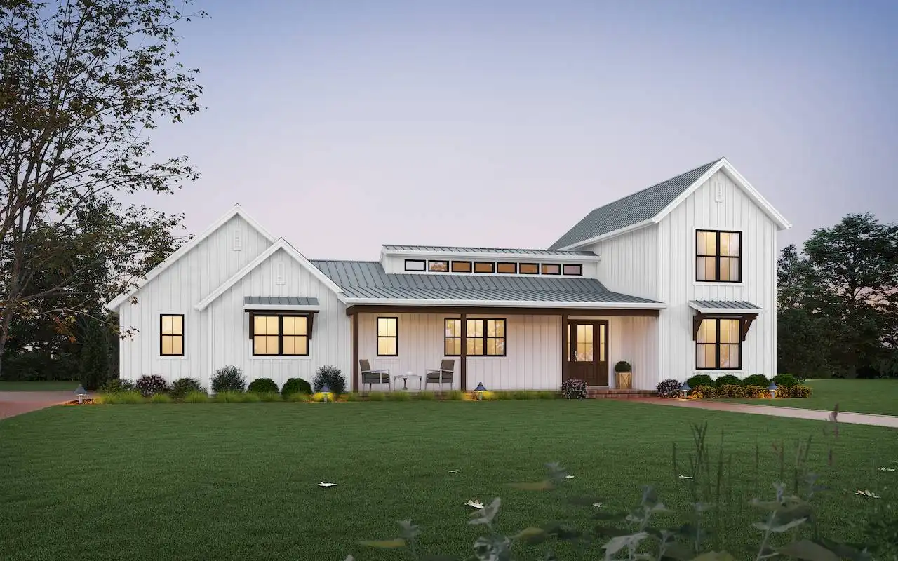 This gorgeous modern farmhouse has mixes of more contemporary modern with its lower roof pitches in the center and metal roofing material.