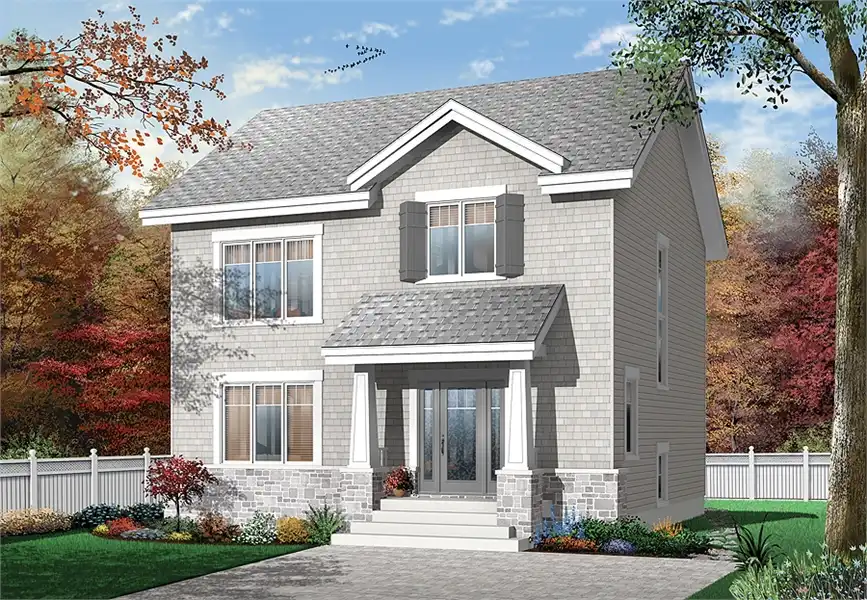 This colonial style house plan features 1,690 square foot of living space. The spacious entrance with large coat closet and an access to a half-bath with integrated laundry closet is just the start. Large windows over kitchen sink and corner pantry bring in a lot of natural light. A three-sided fireplace is shared between the living and family rooms, that makes for those cozy nights. Triple garden doors in dining room make for a great view. Very comfortable bedrooms, each with large closet, and hallway access to the organized bathroom that has dual vanities and a separate shower.